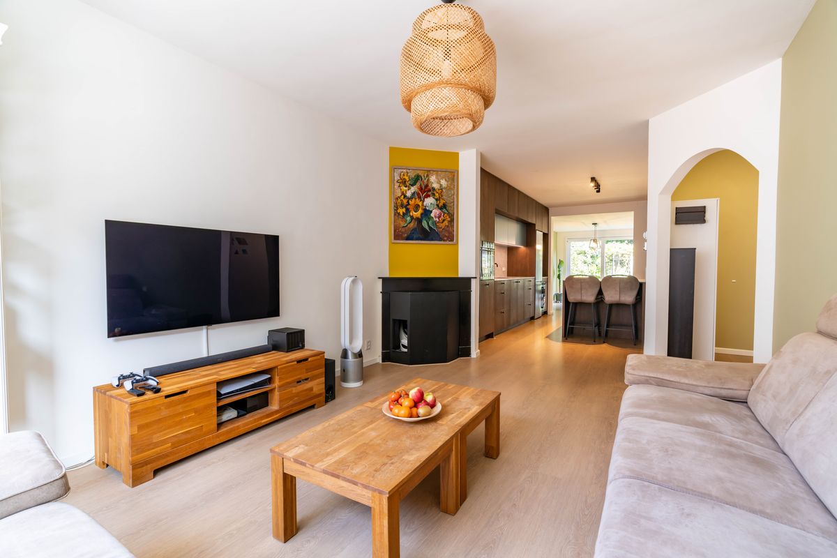 Upon entering, you'll find the vestibule, followed by a spacious hallway and hall. From here, you enter the living room, located at the front of the house. A spacious living area with pleasant natural light and a fireplace (not functional). The beautiful floor extends into the open-plan kitchen/diner, which separates the living room and dining room. The kitchen was custom-built in 2022 and is fully equipped, including a Quooker, a climate-controlled refrigerator with a coffee corner above, a refrigerator-freezer, oven, an induction cooktop on the island, a dishwasher, and ample workspace on the Marble countertop and plenty of storage space.