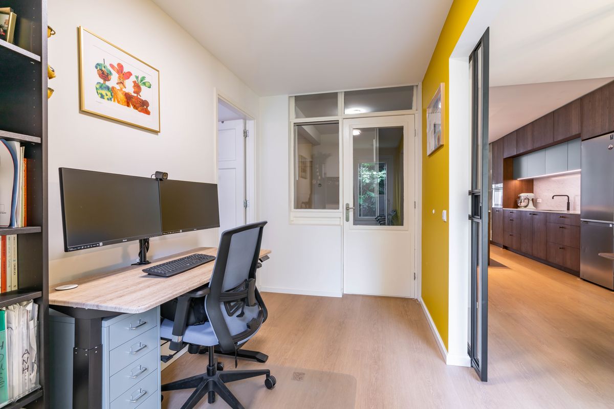 Vanuit de eetkamer een doorgang met stalen schuifdeur naar de studeerkamer. Erg prettige plek om een dagje thuis te werken, met uitzicht op de tuin. In deze kamer is tevens een aparte bergkast met opstelplaats Cv ketel (2018). Vanuit de studeer kamer toegang tot de twee slaapkamers. De kleinere kamer is direct aan de tuin gelegen en groot genoeg voor een dubbel bed, en kasten. De grote slaapkamer is naast de toegang via de studeer kamer ook bereikbaar vanuit de hal. In de hal een apart toilet, en aparte badkamer. Deze heeft een grote inloop douche, dubbele wastafel met meubel en handige handdoekradiator.