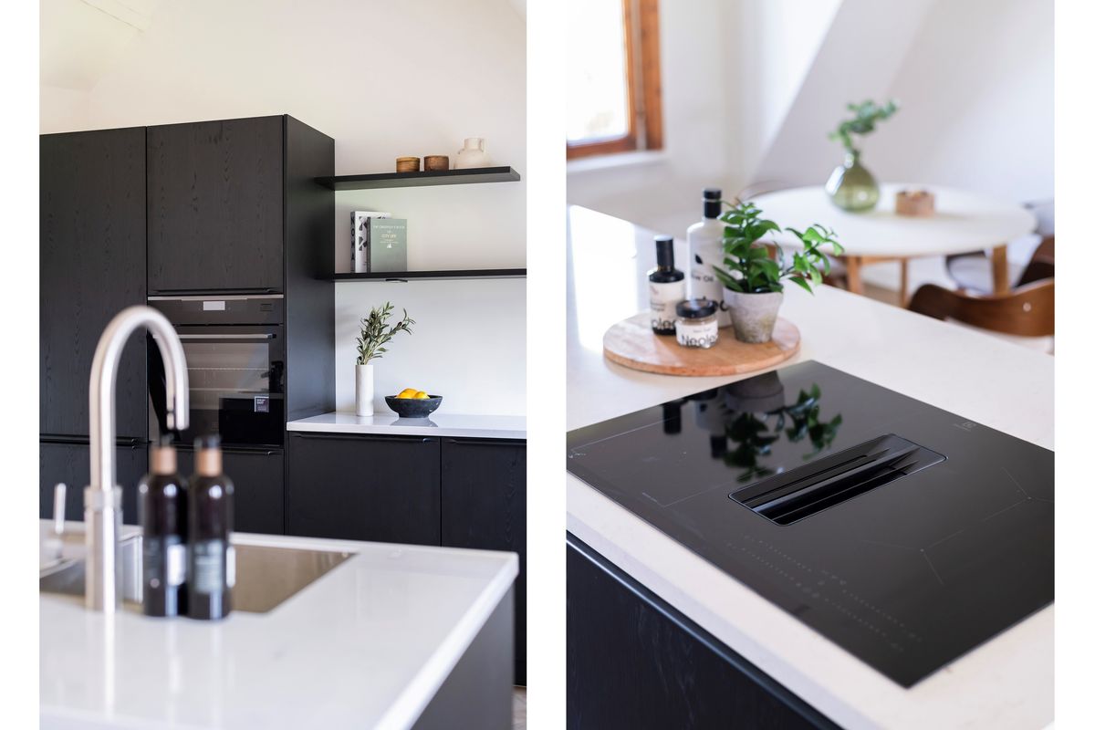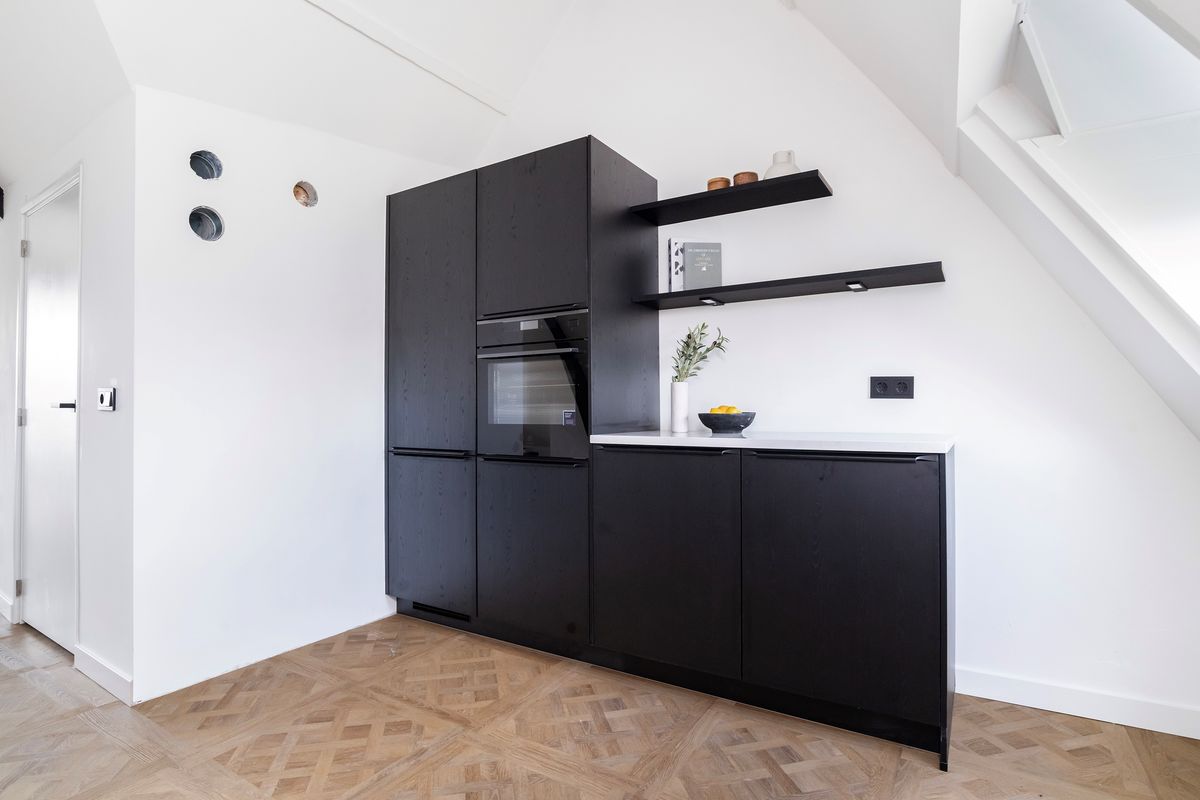 A second staircase leads to the top floor, the true heart of the home. The generous living area offers both a cozy lounge and dining space, illuminated by large windows bringing in abundant natural light. The open kitchen is directly connected to the living room and forms the perfect spot for cooking and socializing. It comes equipped with built-in appliances such as an oven, dishwasher, hob with extractor and a fridge-freezer, ideal for those who enjoy cooking and entertaining.