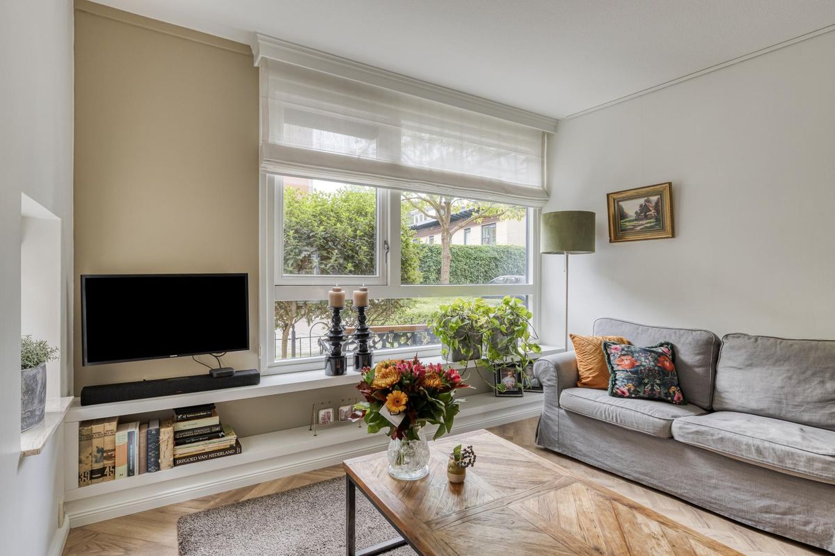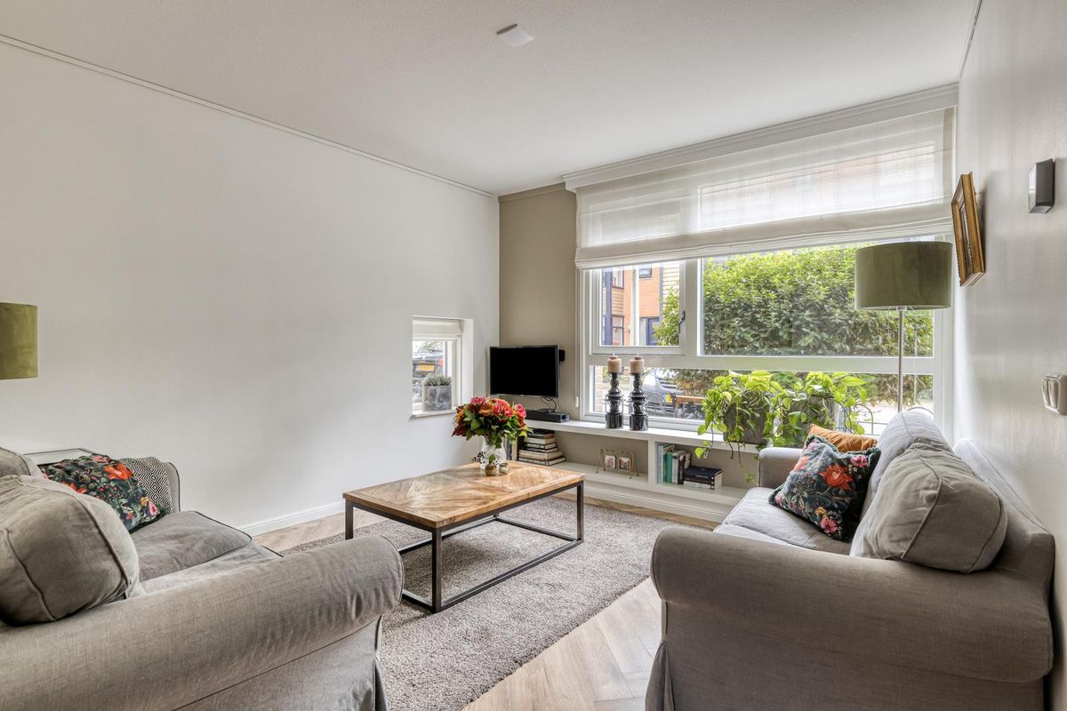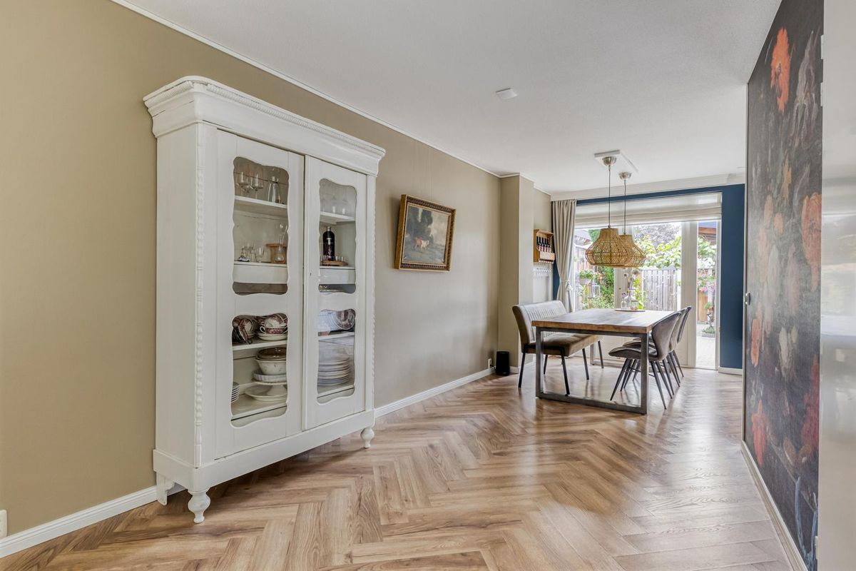 De woonkamer is een fijne leefruimte met een moderne visgraatvloer en grote raampartijen die zorgen voor veel daglicht. Aan de voorzijde bevindt zich de gezellige zithoek, terwijl de achterzijde van de woning is uitgebouwd.