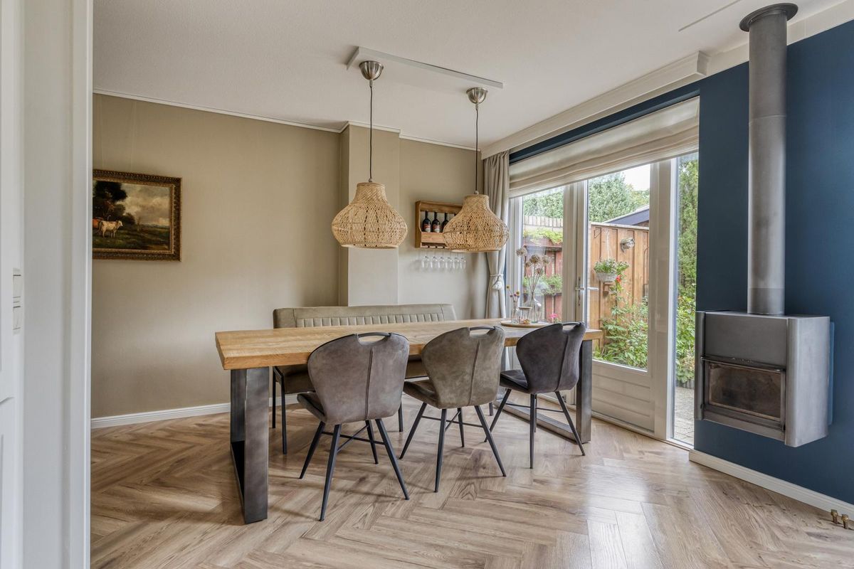 Hier is een royale eethoek gecreëerd, voorzien van een sfeervolle haard die het geheel extra warmte en gezelligheid geeft. De eethoek staat in direct contact met de keuken, die volledig is ingericht met diverse inbouwapparatuur, waaronder een oven, gasfornuis met afzuigkap, koelkast en vriezer. Vanuit de deur bij de keuken én via de dubbele tuindeuren bij de eethoek is er toegang tot de zonnige achtertuin.