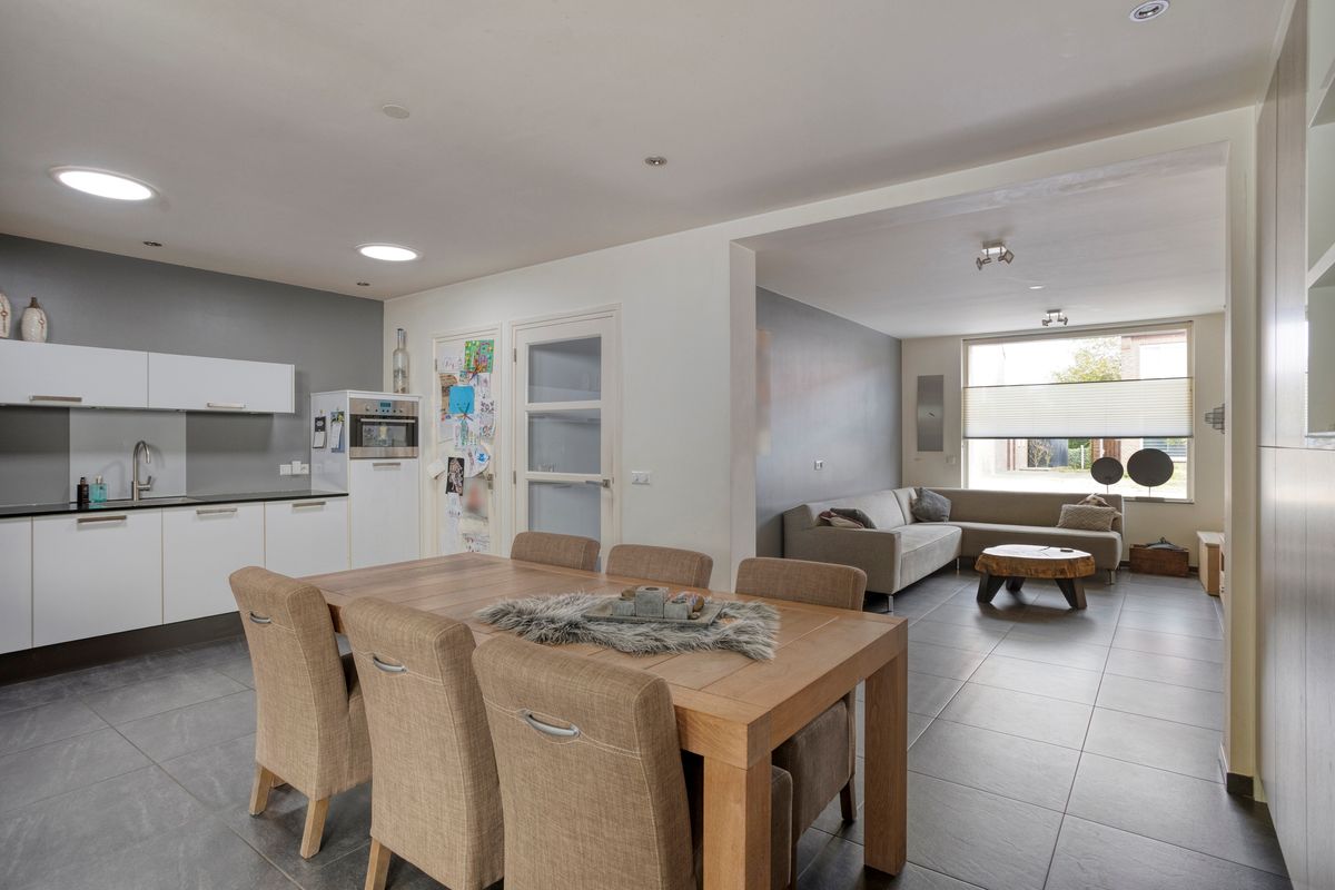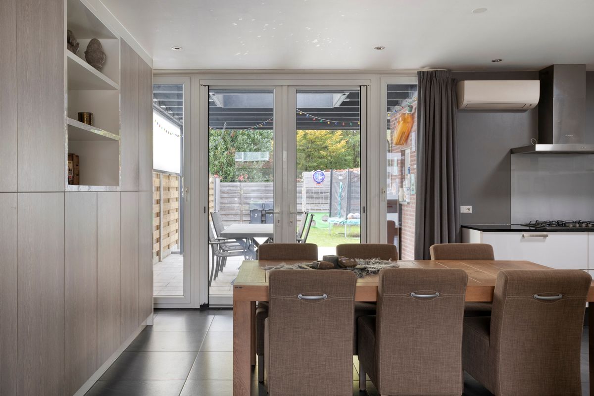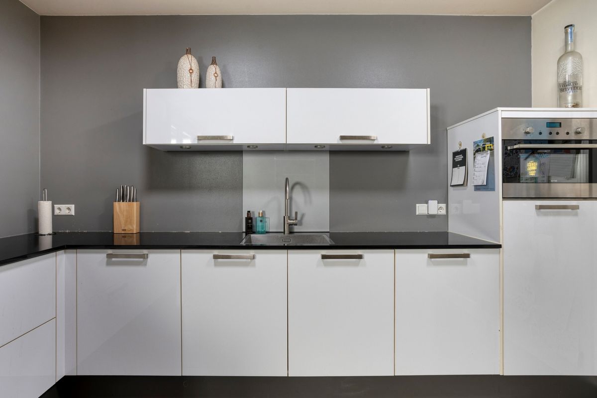 De halfopen leefkeuken is uitgevoerd in een praktische hoekopstelling met volop opbergruimte en moderne apparatuur, waaronder een combimagnetron, kookplaat, oven, koelkast en afzuigkap. Vanuit de keuken heeft u een prachtig zicht op de achtertuin, die via openslaande tuindeuren bereikbaar is.