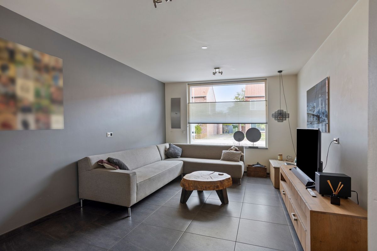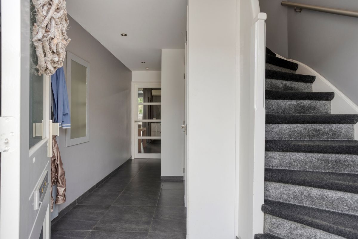 Bij binnenkomst ervaart u direct de lichte, uitnodigende sfeer. De hal biedt toegang tot het toilet en leidt naar de woonkamer, die is verdeeld in een zit- en eetgedeelte. De plavuizenvloer met vloerverwarming zorgt voor een aangename warmte en een moderne uitstraling.