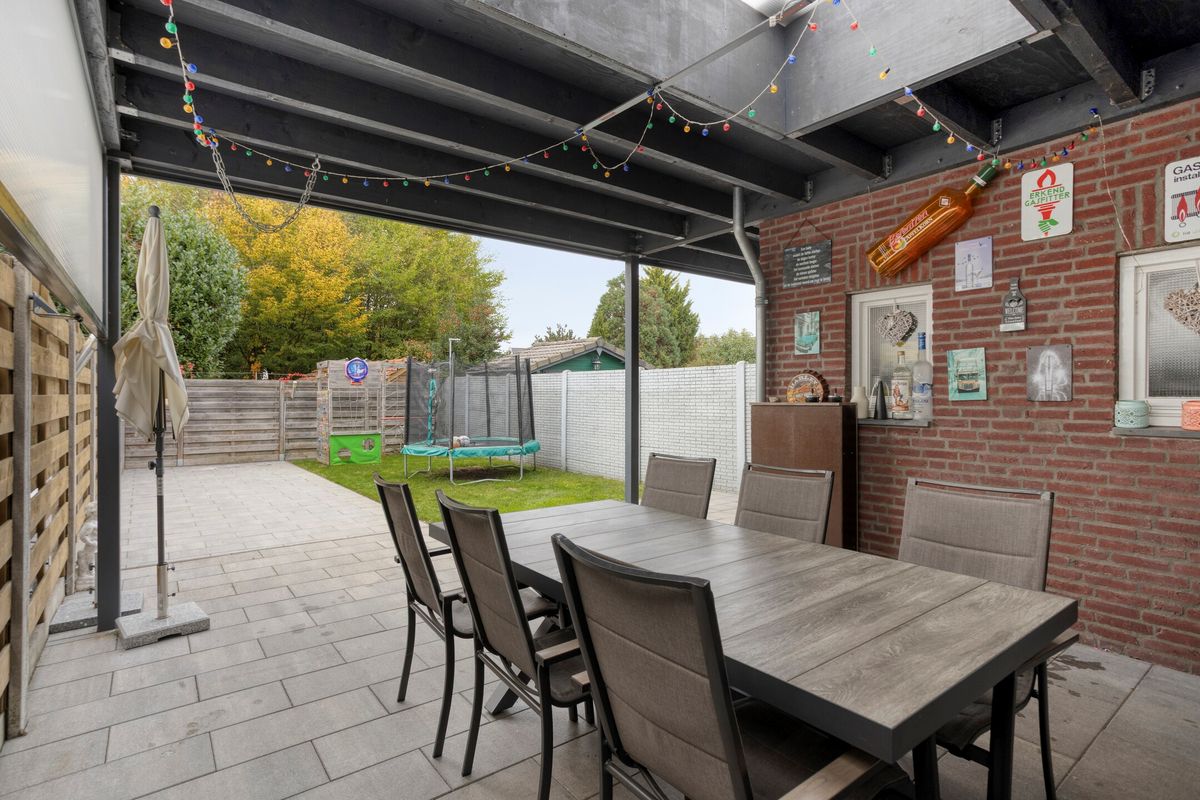 Via de zij-ingang bereikt u de volledig omheinde achtertuin met terras, overkapping, gazon en een gezellig zitgedeelte. De tuinberging biedt extra opbergruimte voor fietsen en tuingereedschap.