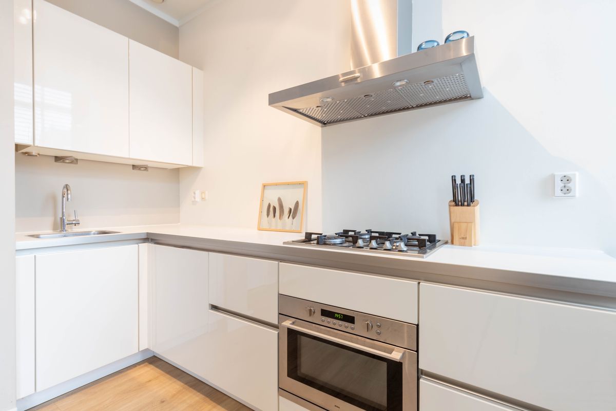 Aan de voorzijde bevindt zich de lichte en ruime woonkamer met hoge plafonds en grote ramen die zorgen voor een prettige sfeer en veel natuurlijk licht. De open keuken is modern uitgevoerd in lichte tinten met RVS-accenten en beschikt over diverse inbouwapparatuur, waaronder een combimagnetron, vaatwasser, gaskookplaat, afzuigkap en koel-vriescombinatie.