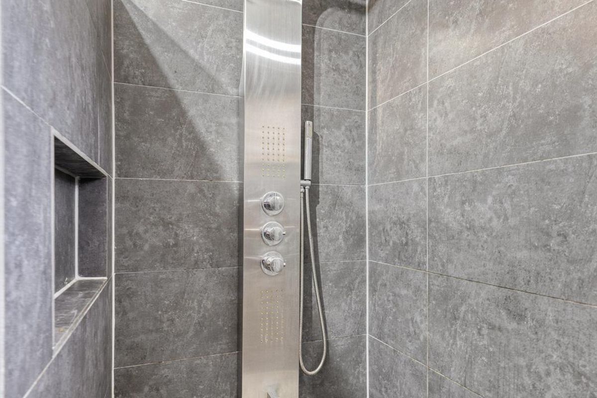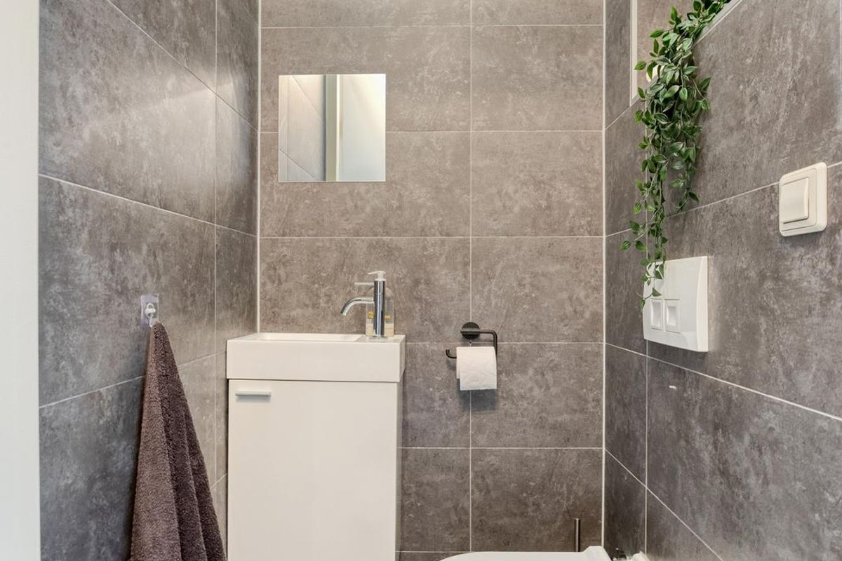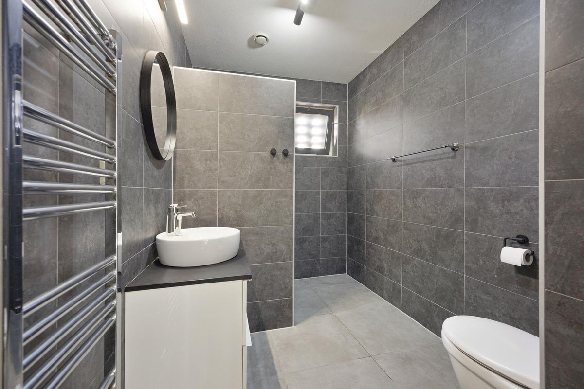 - Badkamer: Moderne badkamer met inloopdouche inclusief luxe douchepaneel, wastafelmeubel, designradiator en tweede toilet. Volledig betegeld in grijstinten.
