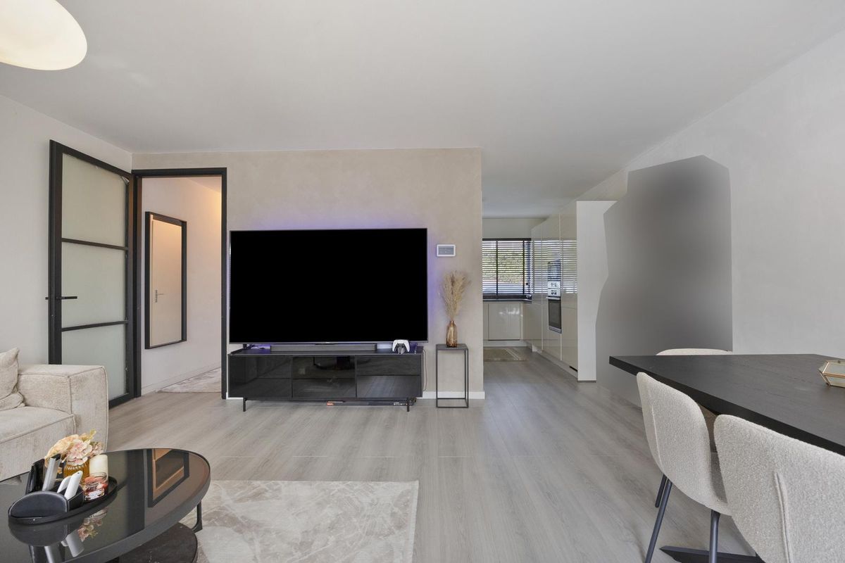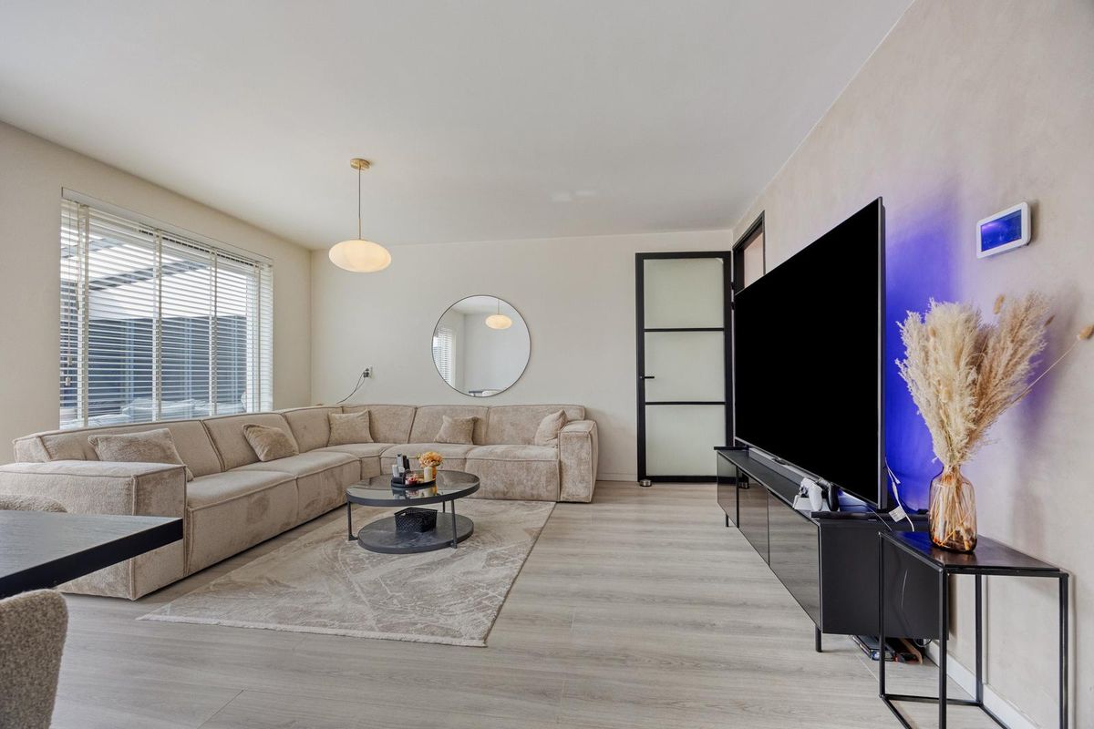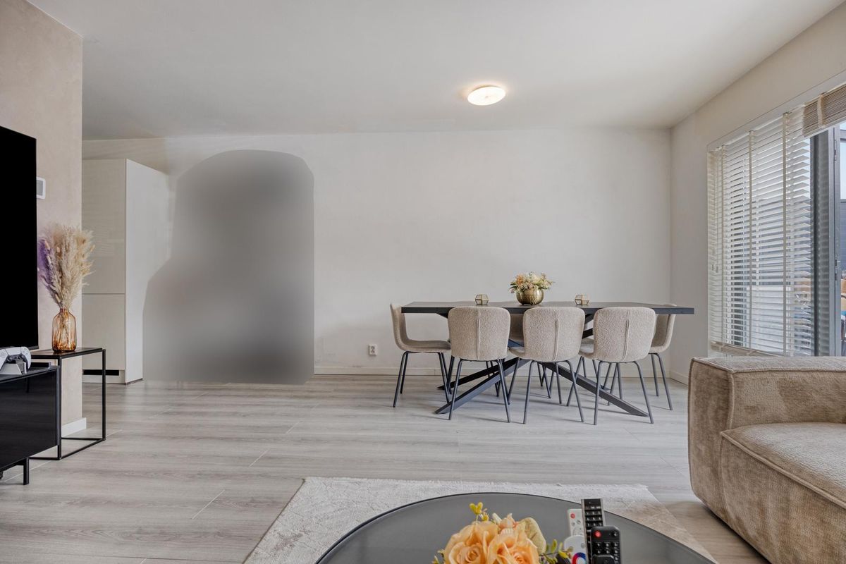 - Woonkamer/ eetkamer: Ruime en lichte woonkamer, grote ramen en een open indeling. De lichte vloer en de moderne stalen deuren geven de ruimte een luxe uitstraling. Aan de achterzijde is voldoende plek voor een grote eettafel.