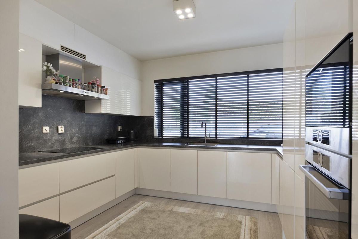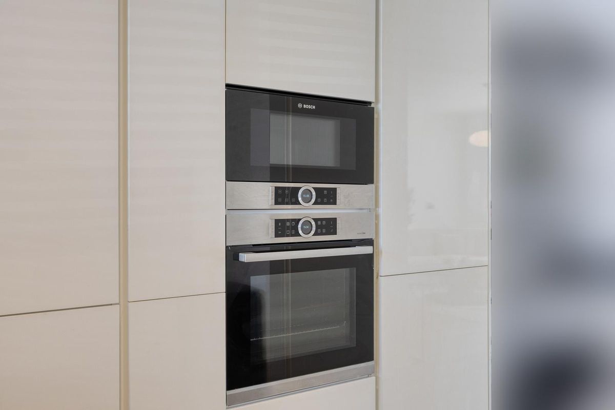 - Keuken: Luxe U-vormige keuken met hoogglans fronten, voorzien van Bosch-inbouwapparatuur zoals een inductiekookplaat, combimagnetron, oven, vaatwasser en koelkast/vriezer. Het donkere werkblad en de achterwand zorgen voor een stijlvol contrast.