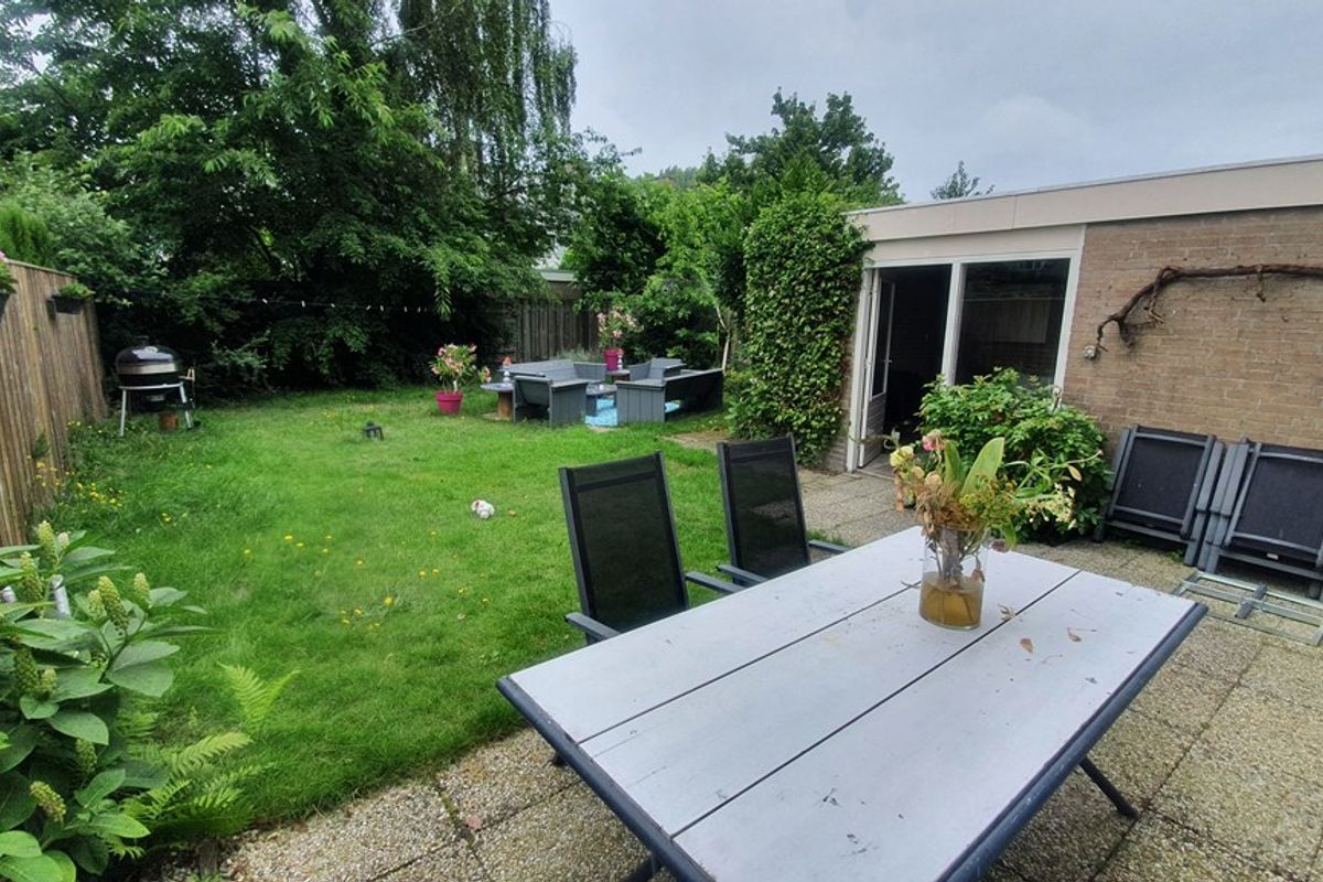 Buiten: diepe achtertuin op het zuiden met achterom, garage (20 m²) en oprit voor meerdere auto’s.