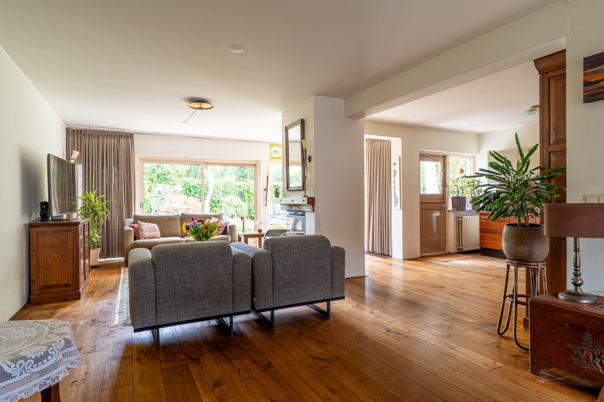 De woonkamer voelt heerlijk licht en open aan. De gezellige haard in het midden maakt het een perfecte plek voor knusse avonden. Via de schuifpui sta je zó in de achtertuin. Aan de voorzijde zit de entree, met toegang tot het toilet, een technische ruimte, de garderobe, de trap én natuurlijk de garage.