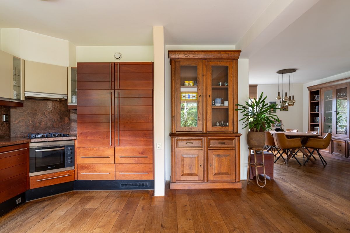 De open keuken staat in verbinding met de woonkamer en is van alle gemakken voorzien. Denk aan een 4-pits gaskookplaat, afzuigkap, combimagnetron, vaatwasser en koelkast. Het natuurstenen werkblad maakt het helemaal af.