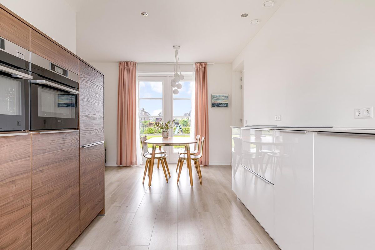 Representatieve entree met modern toilet. De royale leefruimte (plafondhoogte 2,60 m) combineert zit- en eetkamer met een open keuken voorzien van A-merk apparatuur, royaal werkblad en veel kastruimte. Twee openslaande deuren verbinden de living met het zonneterras en de tuin aan het water. Uiteraard overal vloerverwarming/-koeling voor een gelijkmatig en comfortabel klimaat.