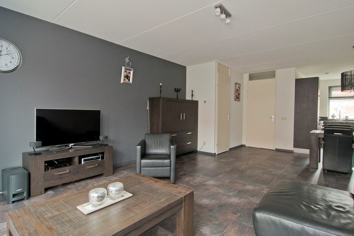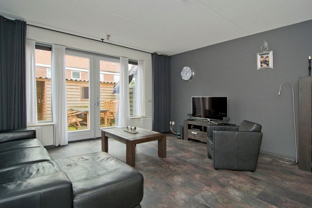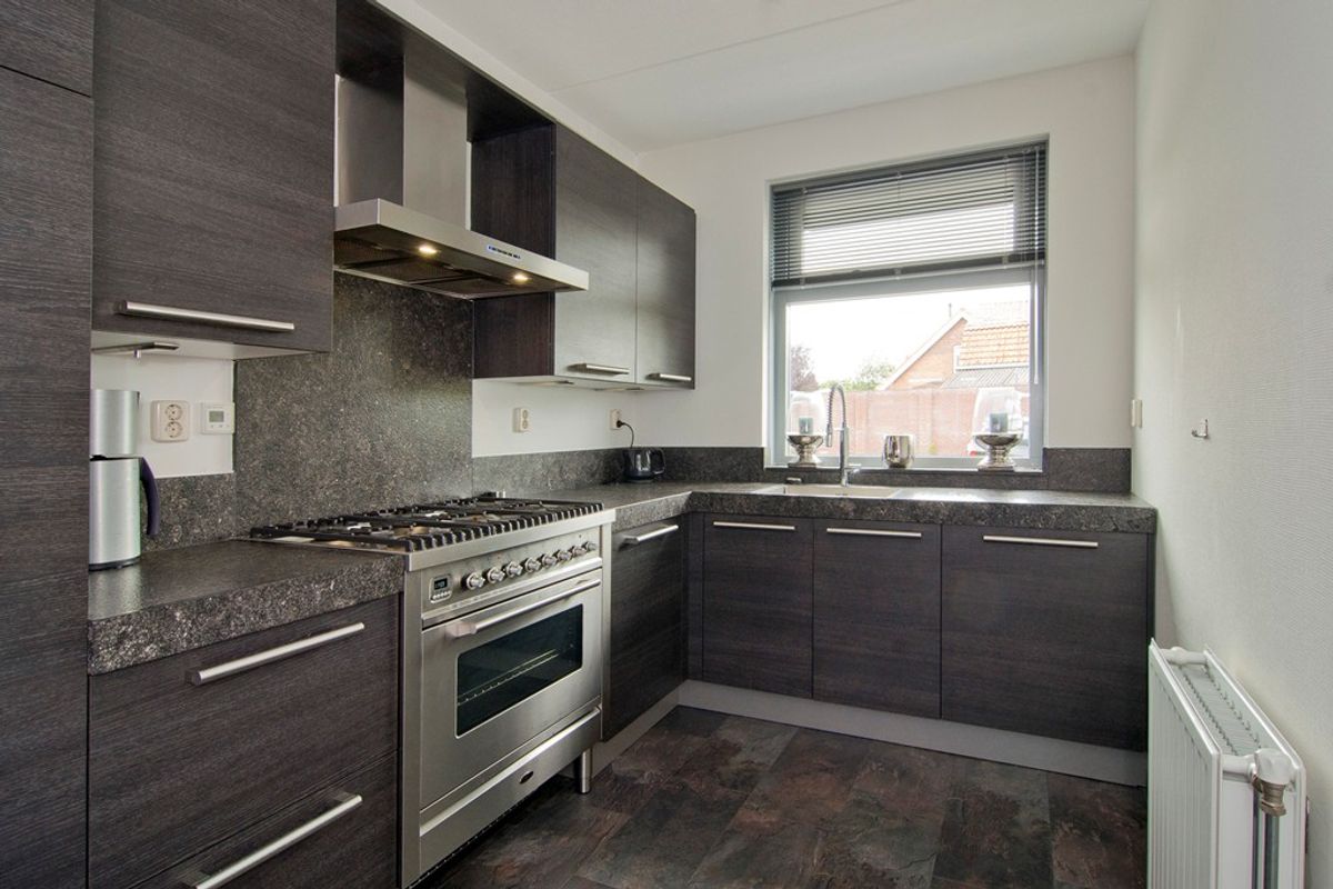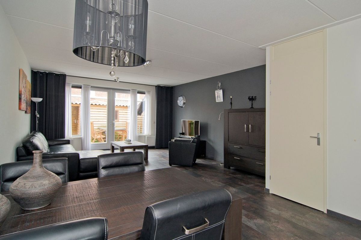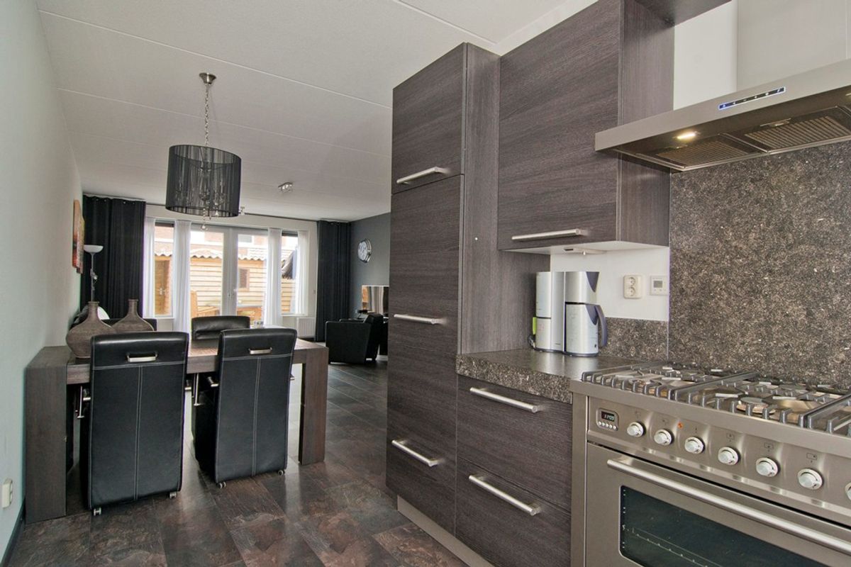 INDELING: entree, hal, meterkast, toilet duobloc closet met een fonteintje, ketelruimte met HR combiketel, riante woonkamer van 35 m2, tuingericht en circa 2.50 meter UITGEBOUWD over de gehele breedte van de woning, derhalve met een ruime keuze aan indelingsmogelijkheden. De woonkamer heeft een praktische trapkast en OPENSLAANDE DEUREN naar de zongunstig op het Zuid-oosten gelegen, onderhoudsarme, kleine tuin met veel straatwerk, een houten berging met afdak en een achterom. Aan de voorzijde van de woning ligt de open straatgerichte keuken met een schitterende, moderne, L-vormige opstelling in donkere houttint en v.v. een hoogwaardig ZWART GRANIETEN BLAD, een ingebouwde vaatwasser en koelkast, een 6-pits breed BORETTI KOOKTOESTEL met heteluchtoven en afzuigkap (eveneens Boretti). De gehele begane grondvloer is afgewerkt met laminaat in leisteenlook en de wanden met glasvliesbehang.