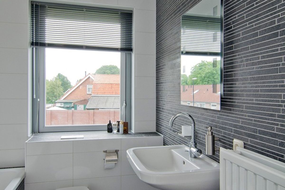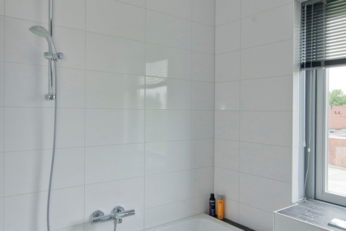 1E VERDIEPING: gehele verdieping voorzien van tapijt, overloop, 2 riante slaapkamers (11 en 17 m2) waarvan de hoofdslaapkamer aan de achterzijde (L-vormig) gesplitst kan worden in een tweetal slaapkamers, KEURIGE BADKAMER welke deels is betegeld met witte wandtegels en deels met donkere tegelstrips. De badkamer is voorzien van een kunststof ligbad, zwevend toilet en een luxe wastafel.