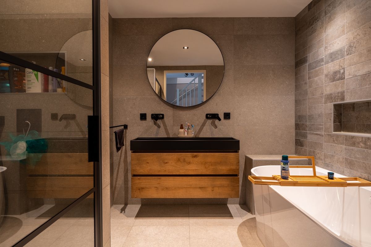 De eerste verdieping beschikt over twee ruime slaapkamers en een luxe badkamer (2022) met inloopdouche, whirlpool, wastafelmeubel, tweede toilet en vloerverwarming.