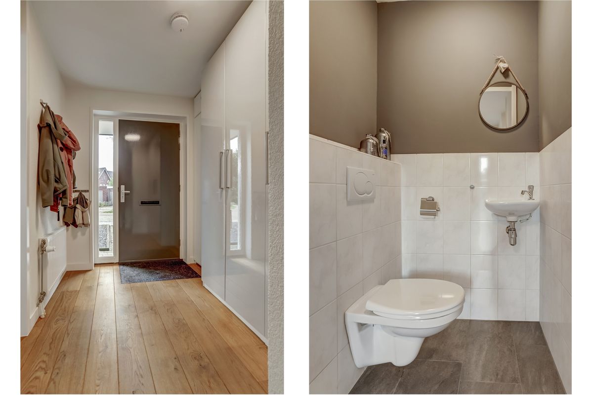 De hal beschikt over een warme houten vloer en biedt toegang tot de meterkast, de trapopgang naar de eerste verdieping en het deels betegelde toilet, waarvan de vloer in 2018 is vernieuwd. Het toilet is voorzien van een hangcloset en fonteintje.