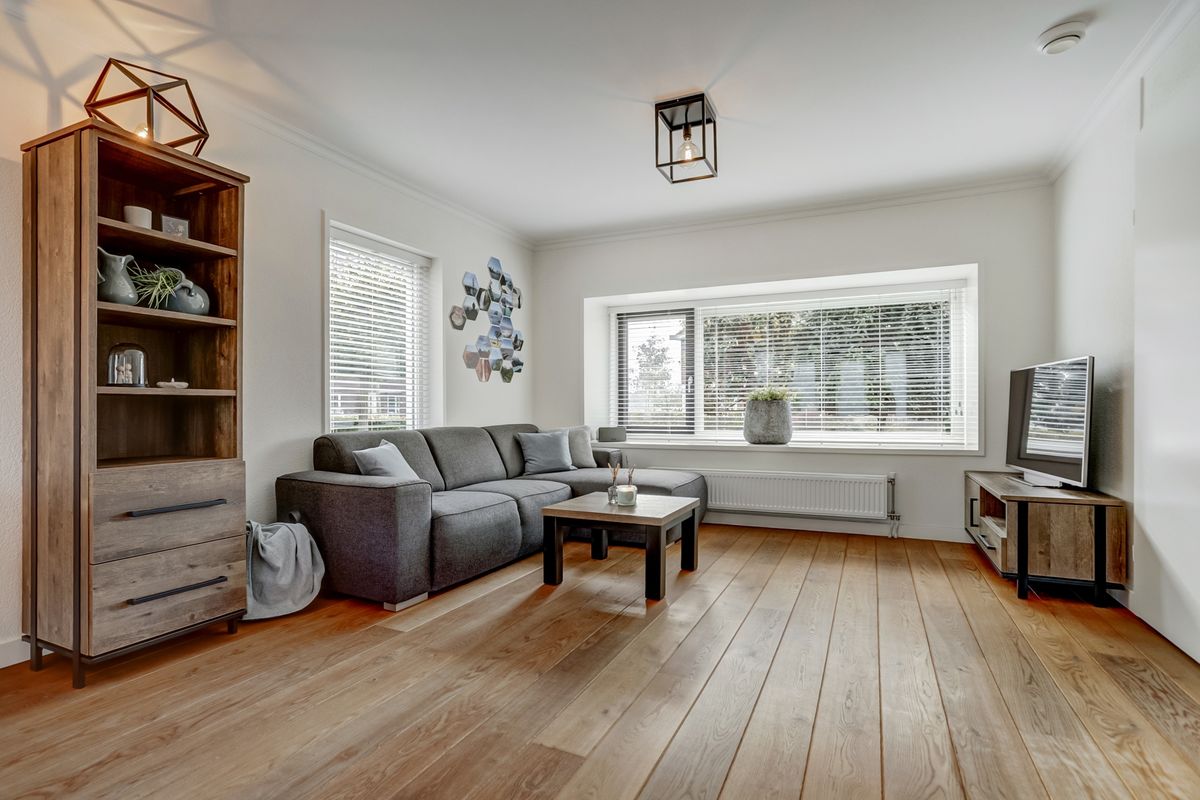 Vanuit de hal stap je door naar de woonkamer waar de houten vloer naadloos doorloopt. De woonkamer is heerlijk licht dankzij de grote raampartij aan de voorzijde, het extra zijraam en de dubbele tuindeuren met glazen zijpanelen aan de achterzijde, een echte doorzonkamer dus! De sierlijsten aan het plafond en de karakteristieke vloer geven het geheel een warme, gezellige sfeer.