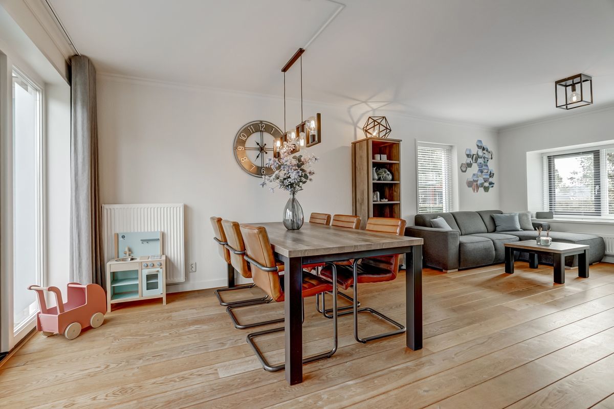 Aan de voorzijde is er plek voor een comfortabele zithoek met uitzicht op de straat. Aan de achterzijde is voldoende ruimte voor een royale eettafel, perfect om met familie en vrienden heerlijk te tafelen met directe toegang tot de keuken.