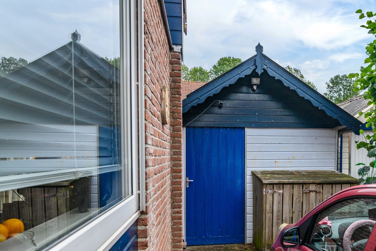In de tuin bevind zich ook een ruime schuur met aansluitend een sfeervolle overkapping – ideaal voor lange zomeravonden of als praktische bergruimte.