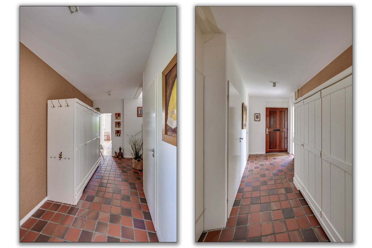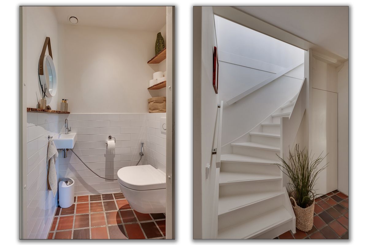 Middels de entree kom je in een ruime hal. De hal is voorzien van de meterkast/bergkast v.v. wasmachineaansluiting en opstelplaats van de mechanische ventilatie unit en de omvormer van de zonnepanelen, de trapopgang naar de eerste verdieping, een trapkast, toiletruimte en geeft toegang tot de woonkamer. De toiletruimte is half betegeld in een witte kleurstelling en voorzien van een zwevend toilet en een fonteintje.