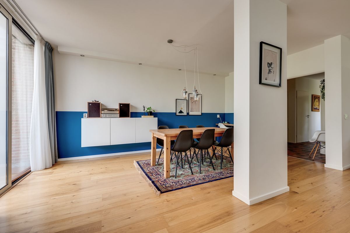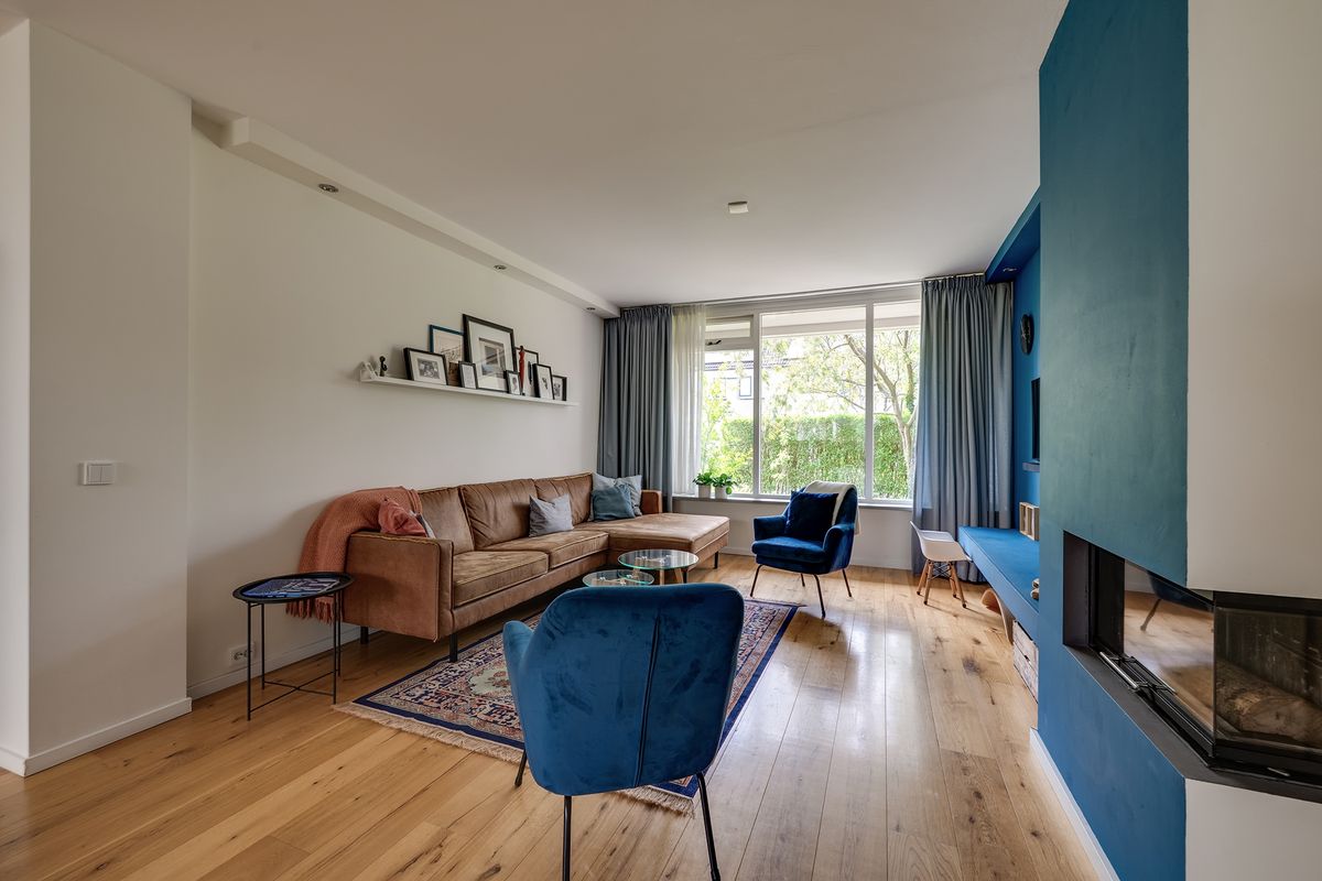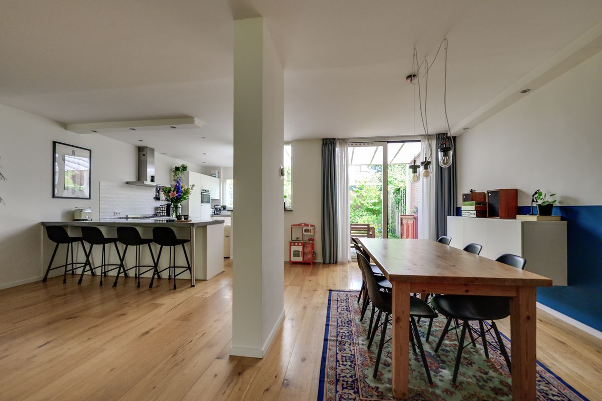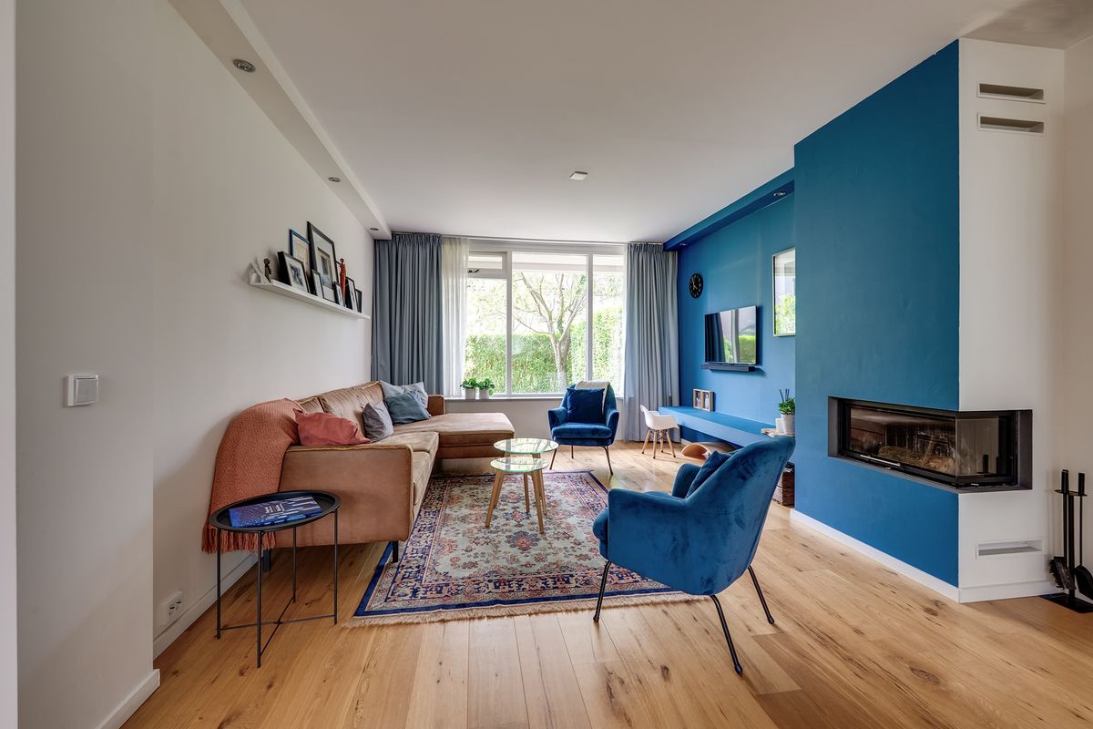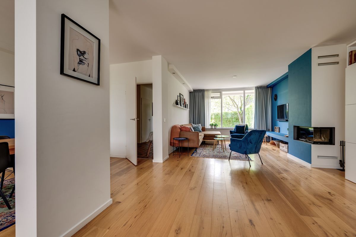 De woonkamer met grote leefkeuken en openhaard is heerlijk licht en ruim van opzet en is eenvoudig in te delen in een woon- en eetgedeelte. De woonkamer en keuken zijn voorzien van een eikenhouten lamelparketvloer, wat zorgt voor een warme en sfeervolle uitstraling. Door de schuifpui naar de achtertuin is er een directe verbinding met buiten.