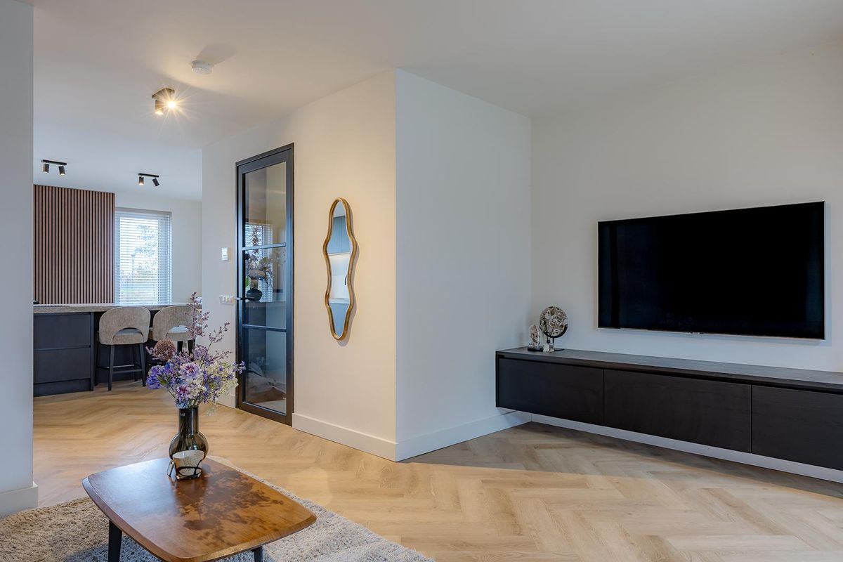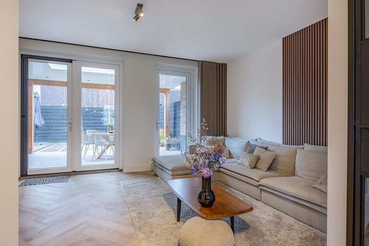 Ruime, gezellige woonkamer met een mooie visgraat pvc vloer (doorgelegd over de gehele begane grond) voorzien van vloerverwarming. De wanden en het plafond zijn voorzien van glad stucwerk. De achtergevel is voorzien van openslaande deuren die toegang geven tot het zeer ruime overdekte terras en de mooi aangelegde achtertuin met betegeld terras. Het prachtige op maat gemaakte tv dressoir blijft achter in de woning.