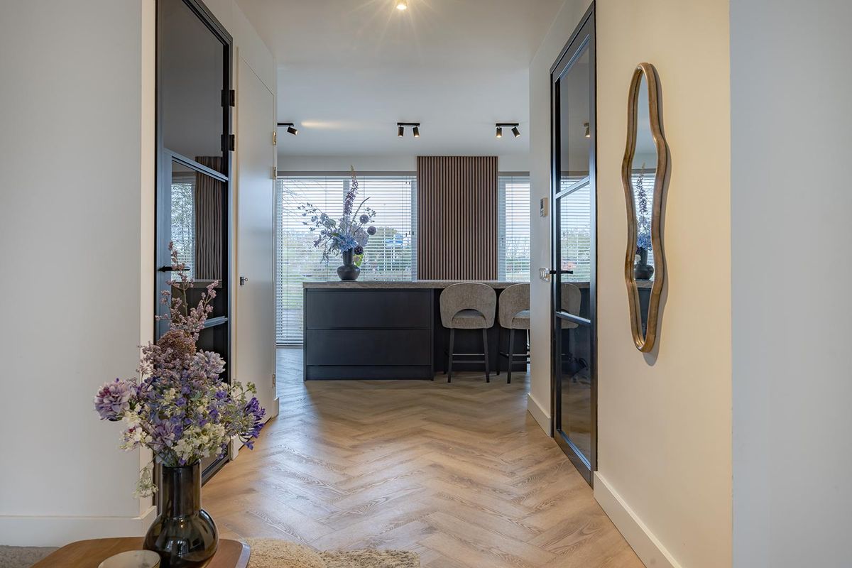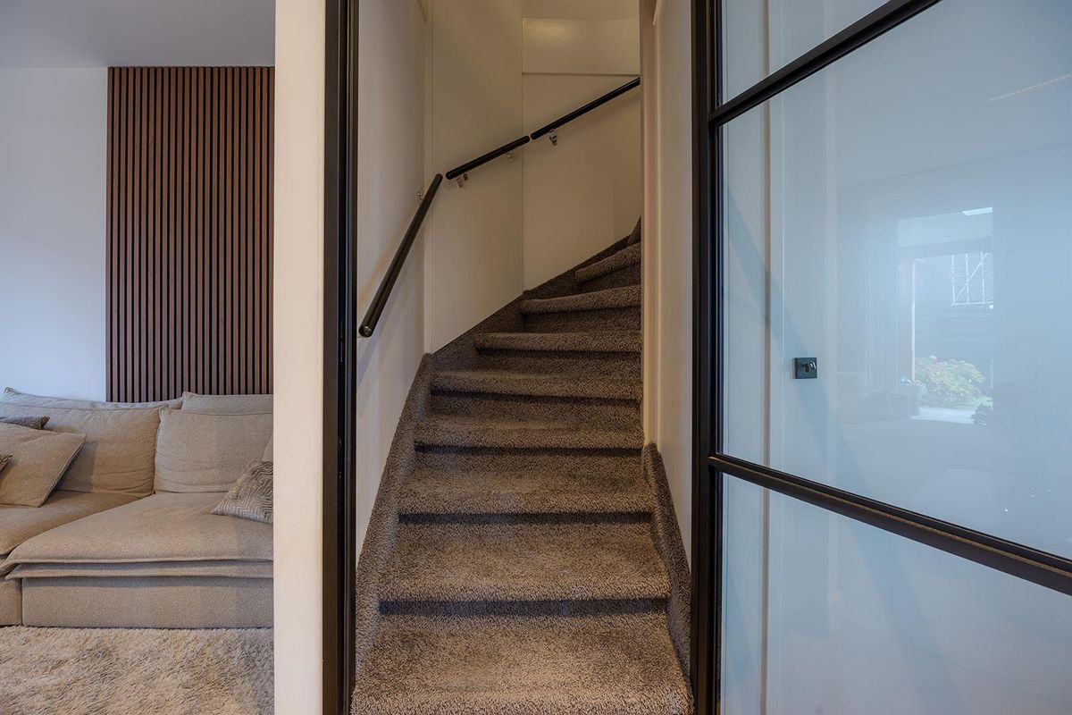Onder de trap is een royale inbouwkast gerealiseerd en de entree c.q. hal en de trap naar boven zijn afgesloten middels respectievelijk een houten en een zwarte stalen deur met lichtdoorlatend glas.