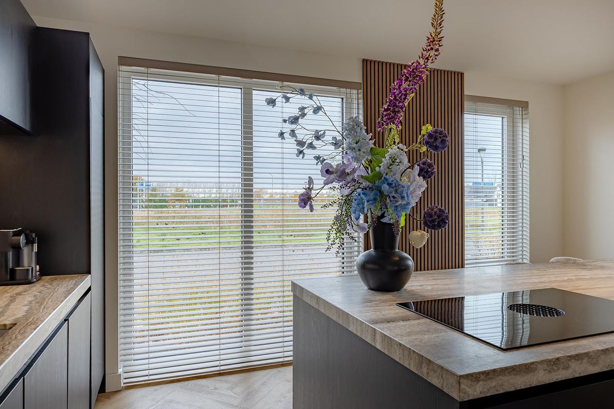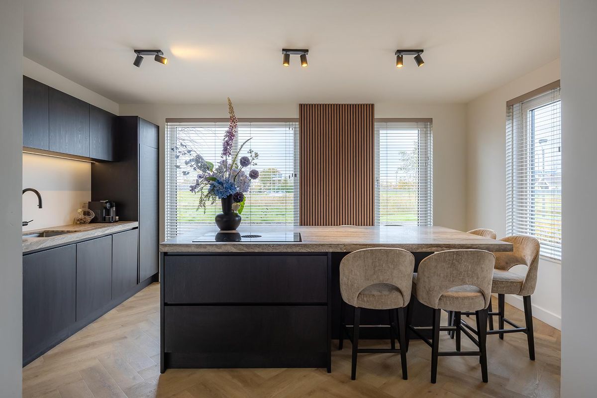 De prachtige open eetkeuken is gelegen aan de voorzijde van de woning en kijkt mooi weg over het groen (blijvend vrij vooruitzicht!). De keuken is voorzien van een moderne, luxe, op maat gemaakte keukeninrichting met kookeiland met een natuursteen (kwartsiet) werkblad met rvs spoelbak en diverse apparatuur zoals: vaatwasmachine, combi oven/magnetron, inductiekookplaat met geïntegreerde Bora afzuigkap, quooker, wijnklimaatkast en koelkast met 0 graden lades.