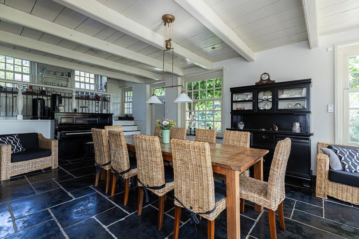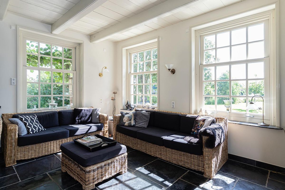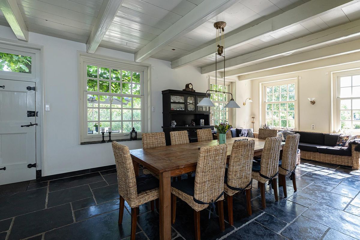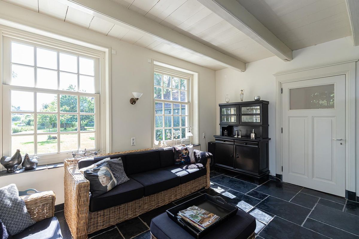 Vanuit de voormalige stal kom je in de woonkamer, waar historie en comfort samenkomen. De natuurstenen plavuizen vloer met vloerverwarming, authentieke balken en een sfeervolle schouw met houtkachel zorgen voor een warme en uitnodigende sfeer. De woonkamer is voorzien van vier schuiframen: twee met 25-ruitsverdeling en twee met 20-ruitsverdeling, alle voorzien van sloten en luiken en uitgevoerd in zwaar houtwerk. Het verfwerk van de buitenkozijnen en luiken is in 2024 nog geheel vernieuwd.