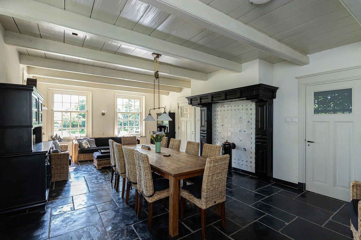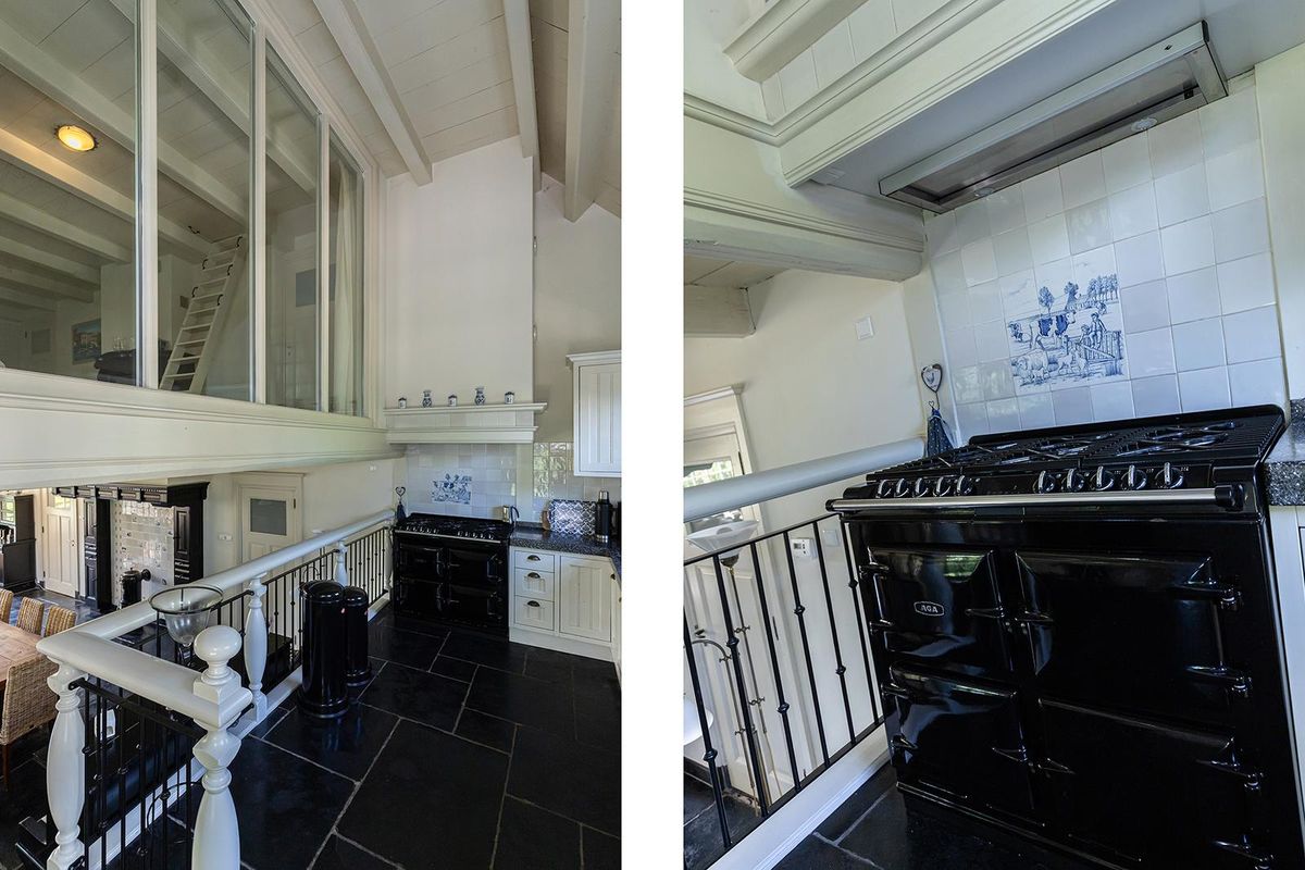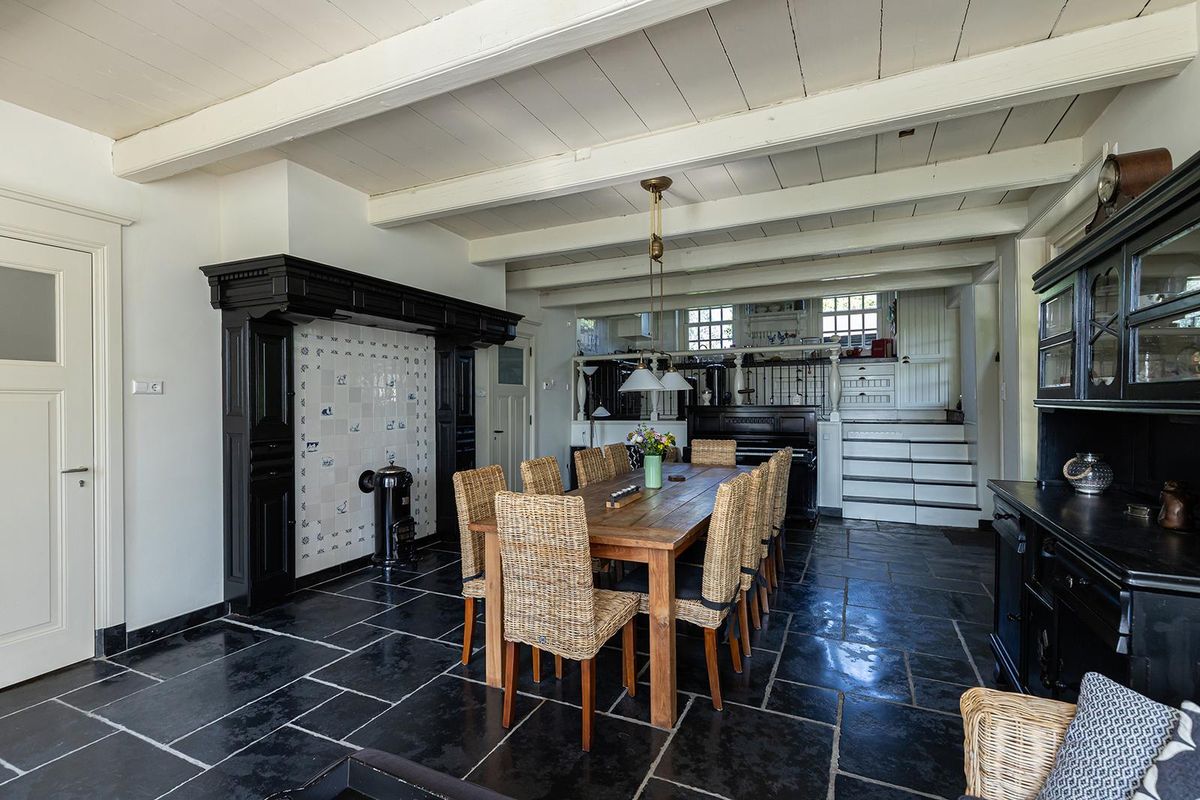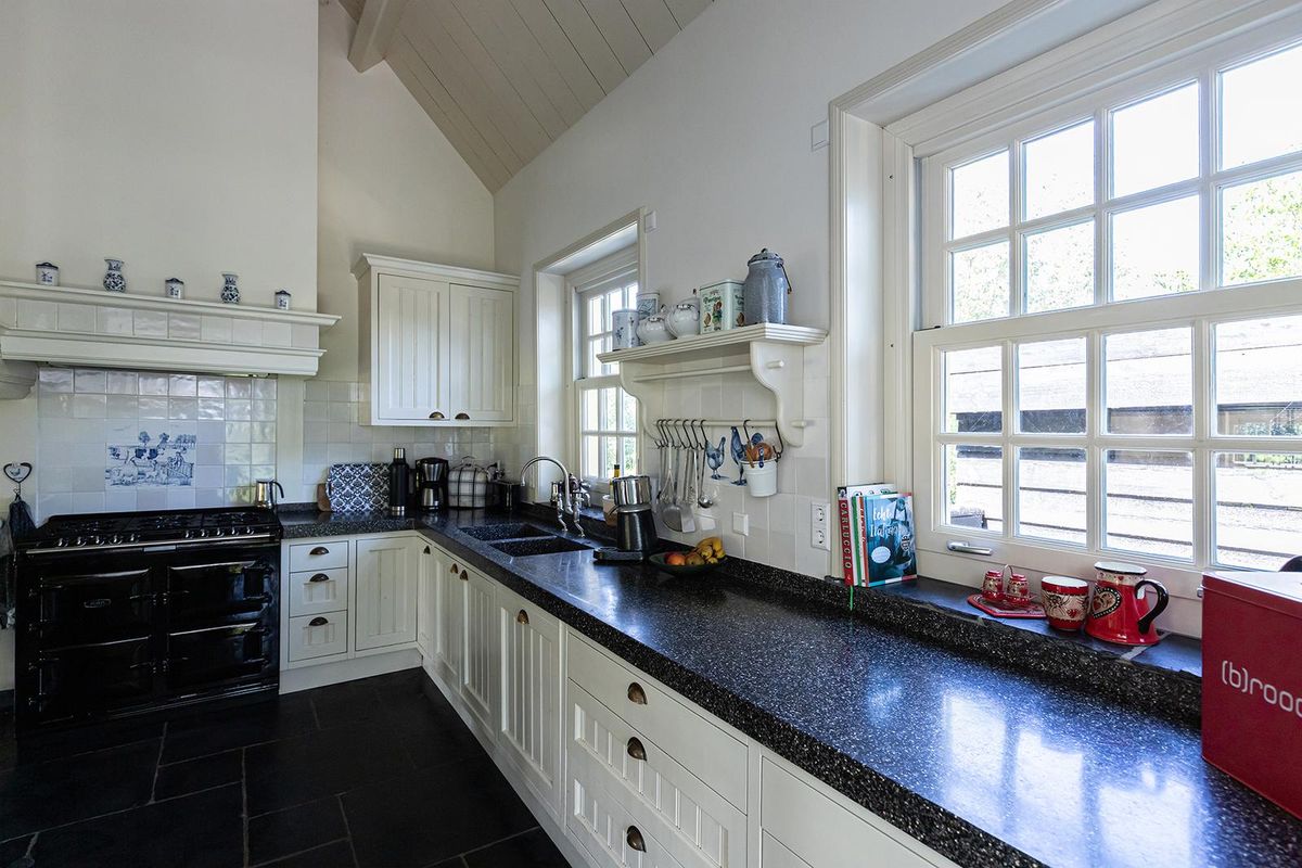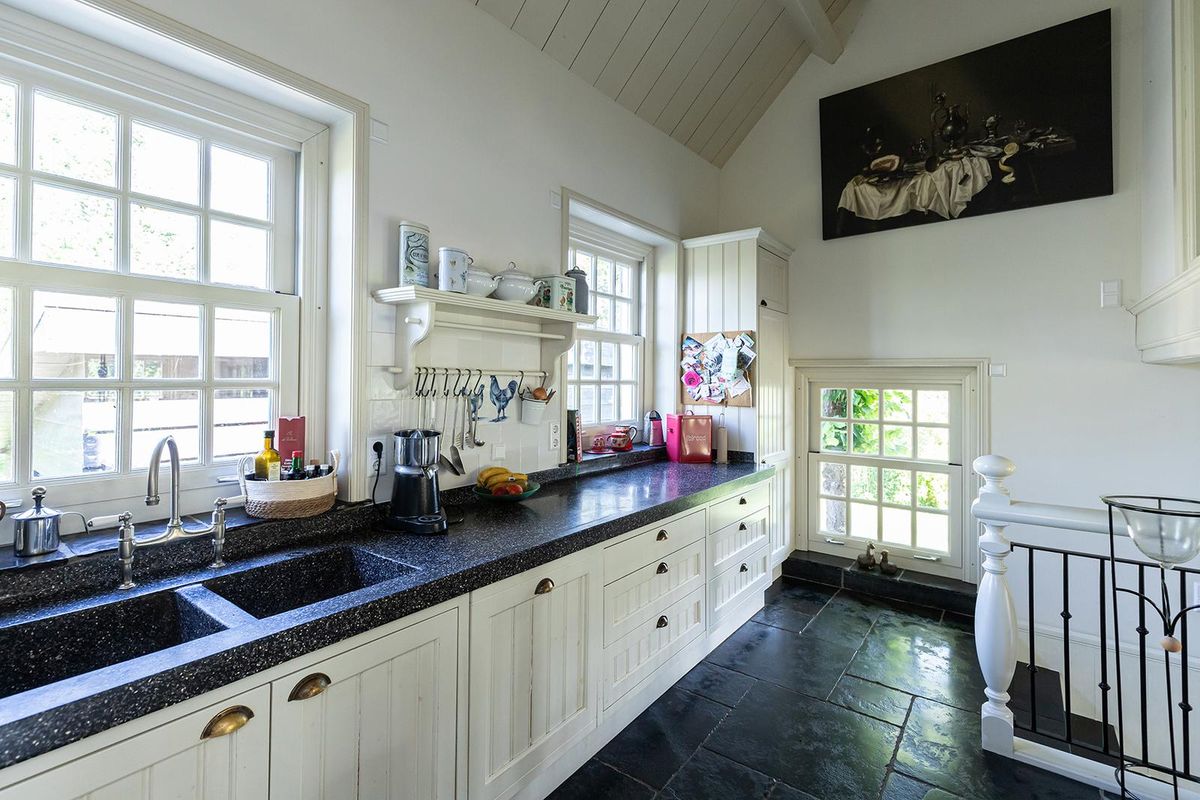 Een kleine trap leidt naar de verhoogde woonkeuken (2009), eveneens met een natuurstenen plavuizen vloer en voorzien van drie 16-ruits schuiframen met luiken. De op maat gemaakte landelijke keukenopstelling is uitgerust met een vijf meter lang terrazzo werkblad in zwart-grijze kleurstelling. Vloerverwarming en hoogwaardige apparatuur maken deze ruimte tot een ideale mix van karakter en comfort.
