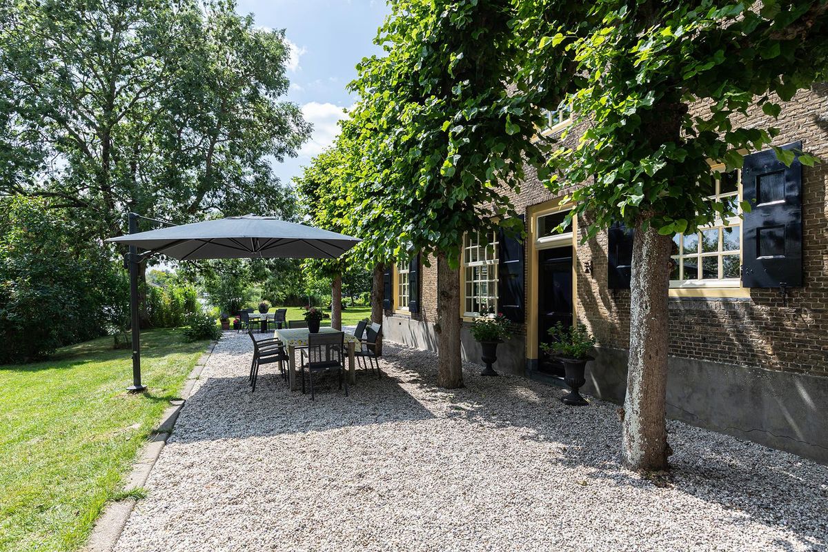 De diepe, fraai aangelegde tuin grenst over de volle breedte aan het riviertje De Alblas. Hier kun je varen, suppen of in de winter starten aan een prachtige schaatstocht. Het erf is, behalve aan de achterzijde van de boerderij, volledig omgeven door water — aan de zuidkant door De Alblas, verder door sloten. Langs het huis ligt rondom een brede grindstrook en aan het water bevindt zich nog een authentiek boenstoepje waar vroeger de was werd gedaan.