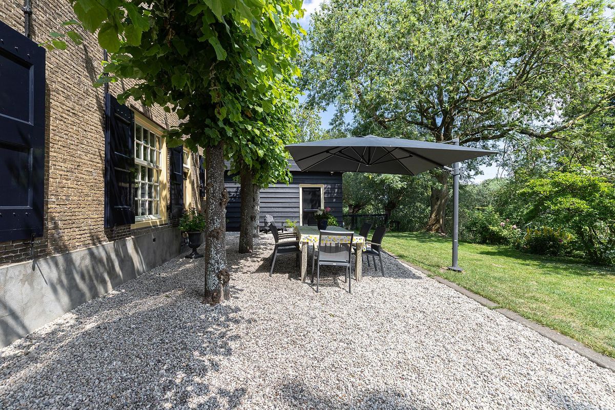De tuin is rijk aan volwassen beplanting, biedt volop privacy en bestaat uit een groot gazon, leibomen en een zonnig terras. Er staan diverse fruitbomen verspreid over het erf, dat zich uitstekend leent voor het houden van kleinvee zoals kippen, schapen of geiten — zonder dat dit ten koste gaat van rust of uitstraling.