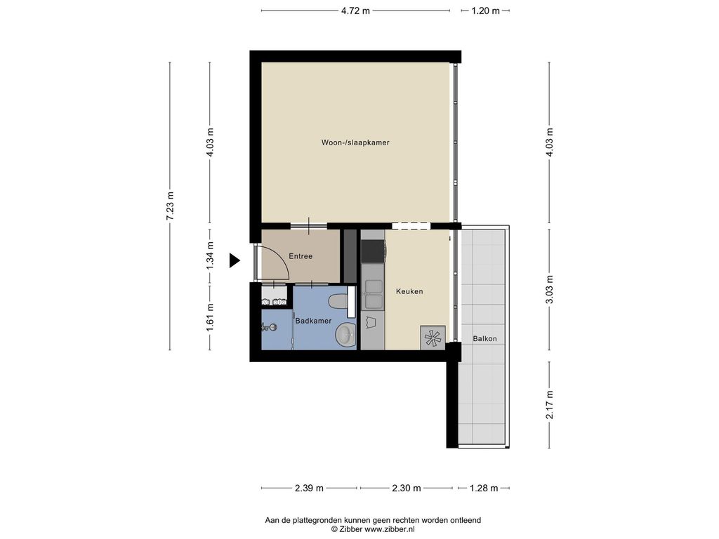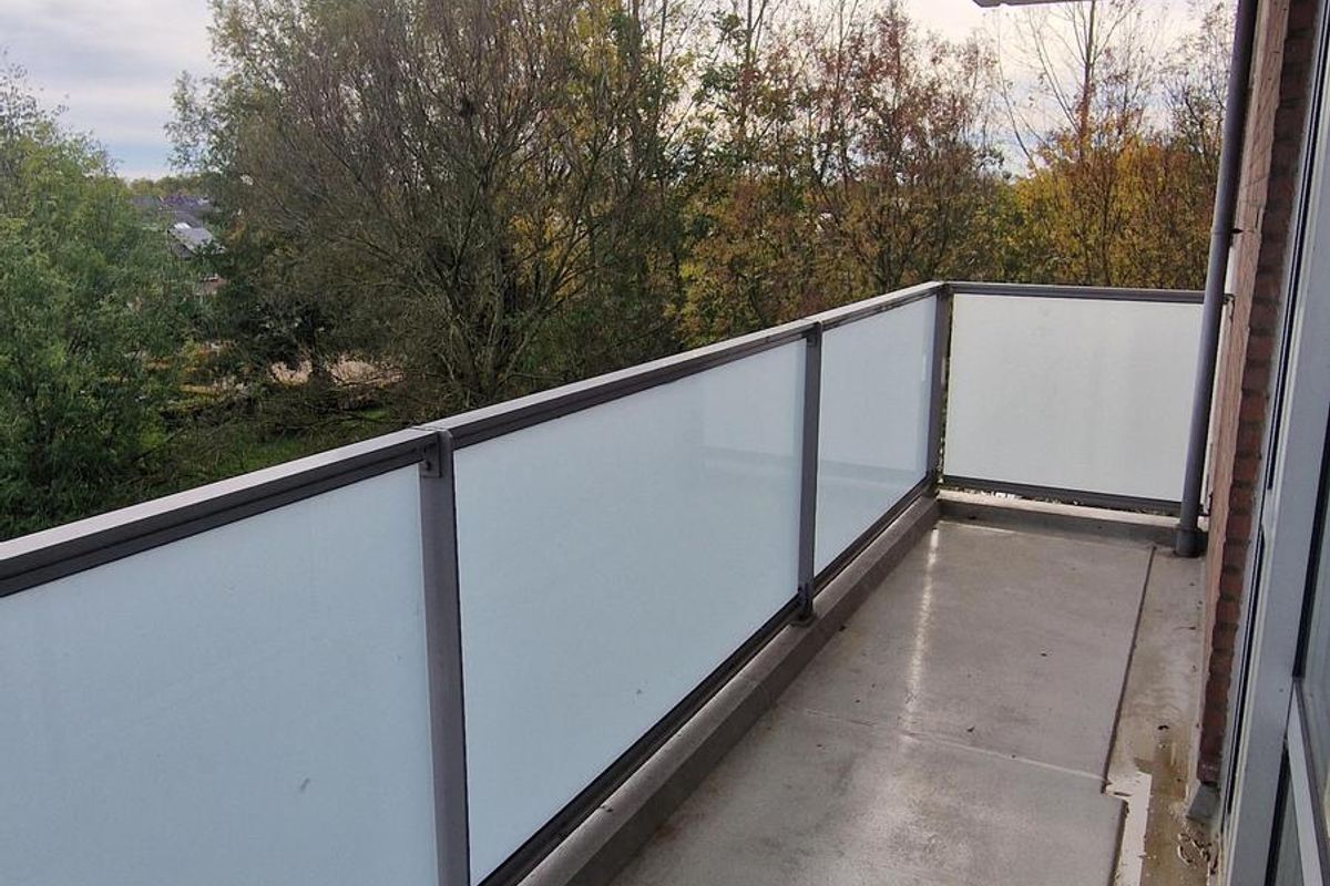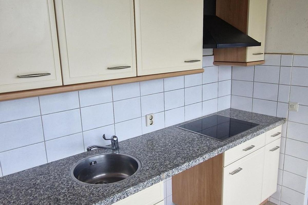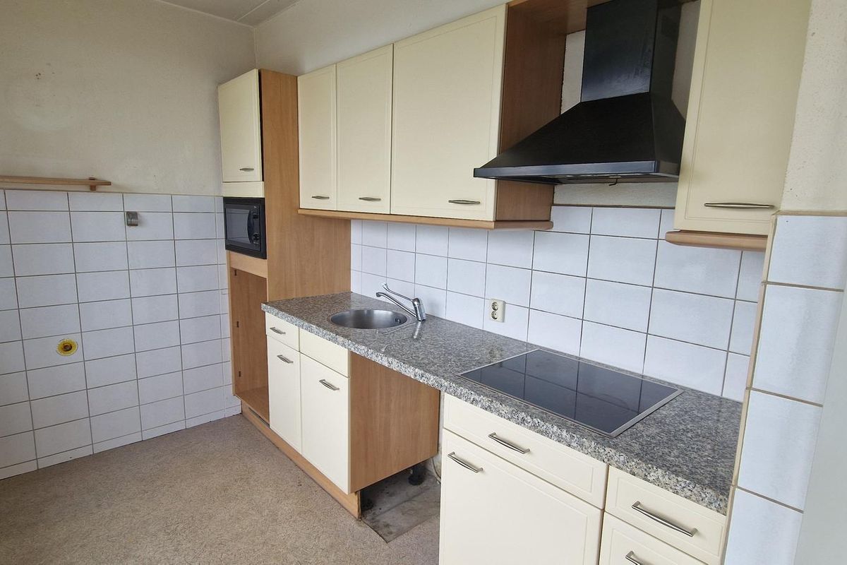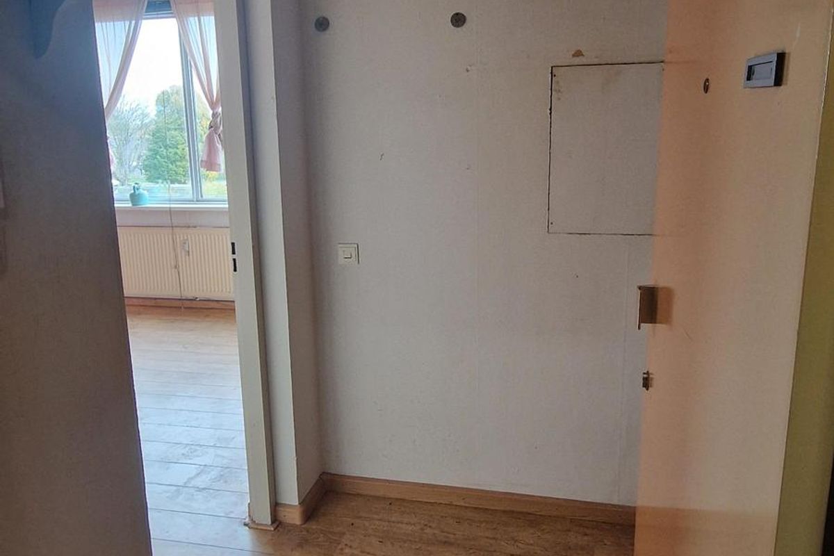 3e verdieping entree, hal, meterkast, doucheruimte met toilet, ruime woonkamer en halfopen keuken met keukenblok, deur naar balkon.