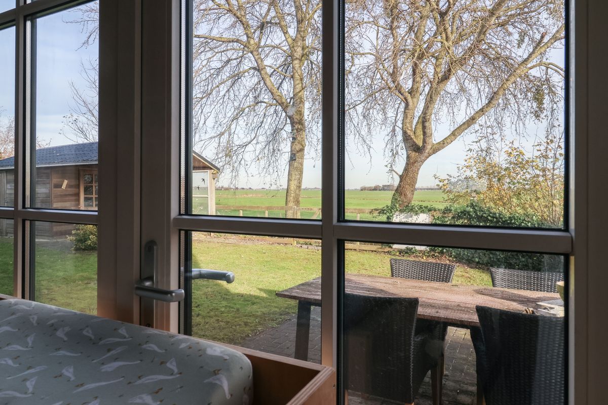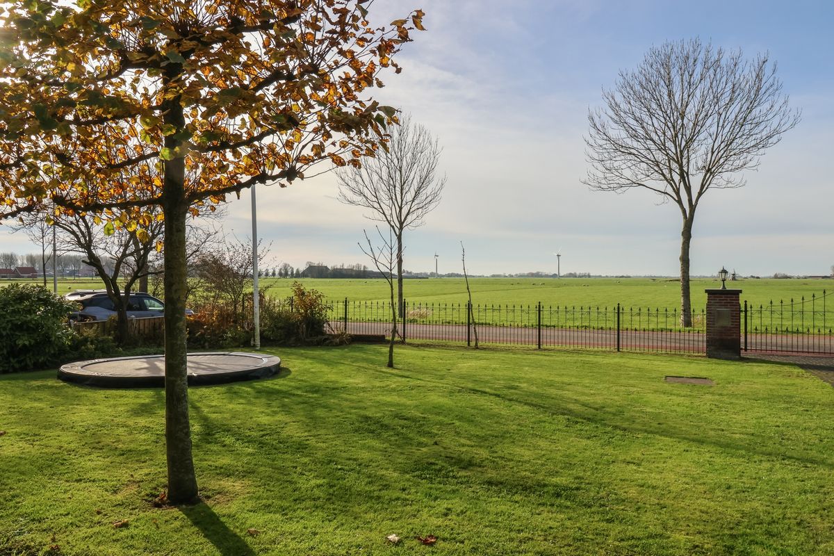 De tuin rondom de woning geeft een weids uitzicht over de landerijen. In de tuin staat een houten berging met overkapt terras.