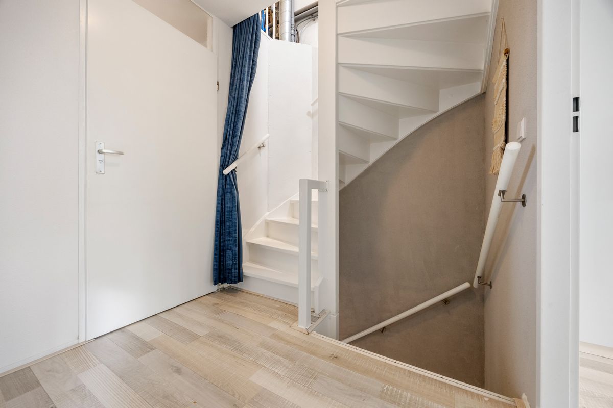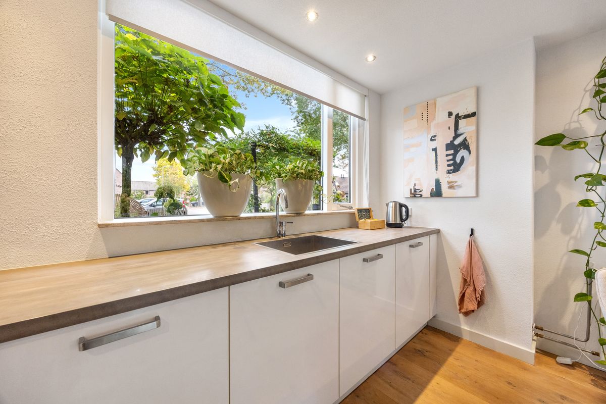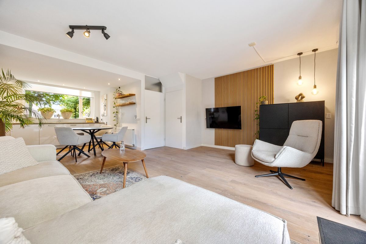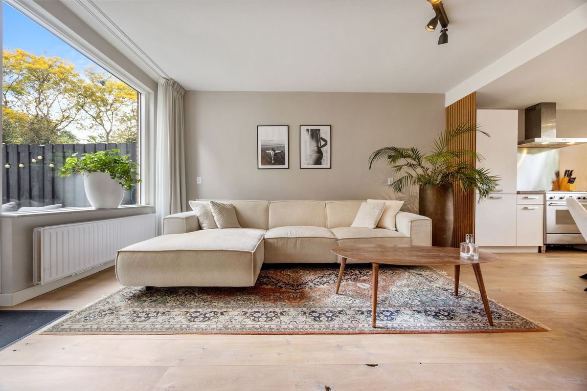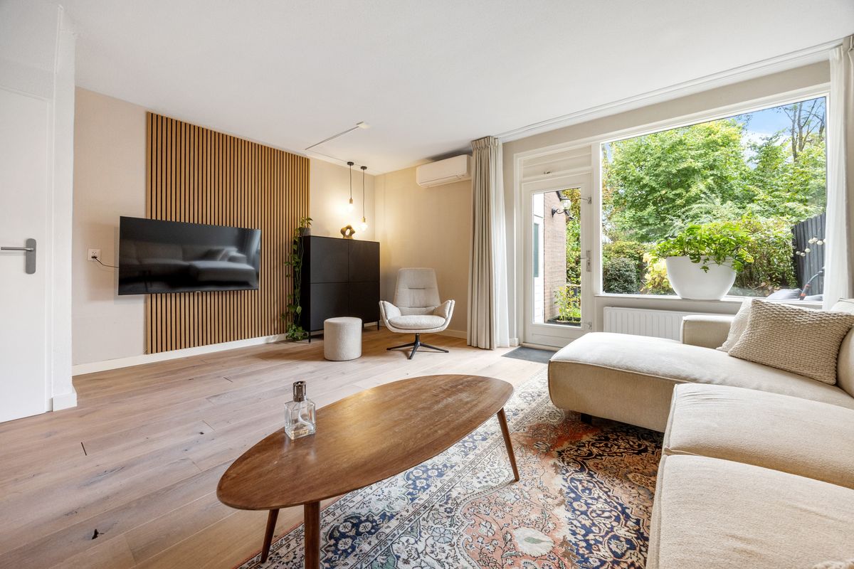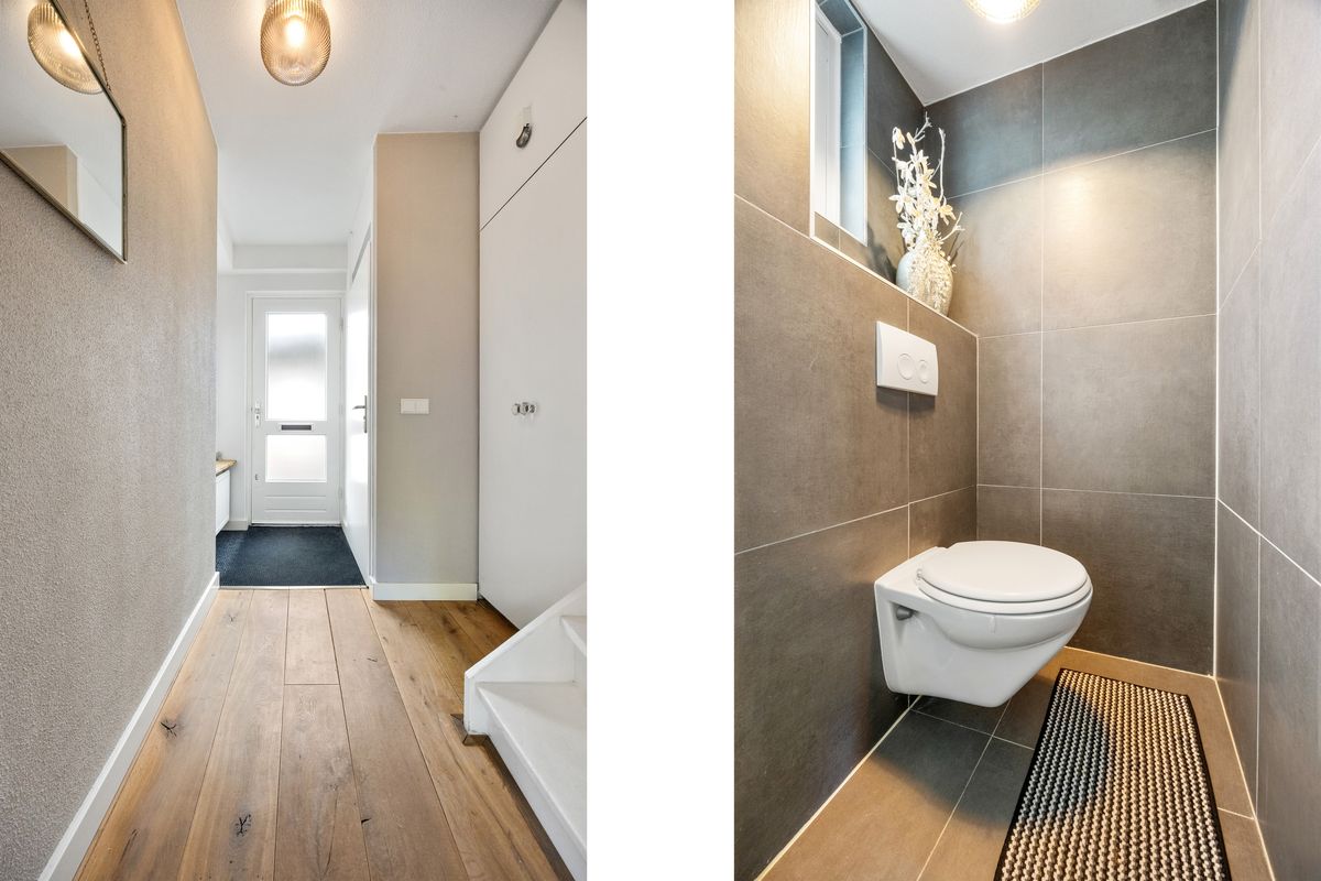 Bij binnenkomst merk je het meteen: dit is een huis waar je zó in kunt trekken. De entree is verzorgd en praktisch, met plek voor jassen en schoenen, de meterkast, het toilet en de trapopgang. Vanuit de hal stap je de woonkamer in. De ruimte voelt ruim en rustig aan, met prettig daglicht en uitzicht op het groen. De houten vloer en lichte muren zorgen voor een ontspannen sfeer.