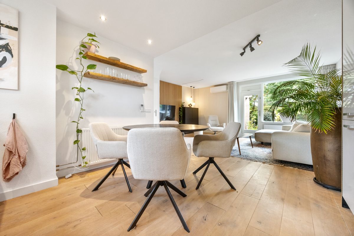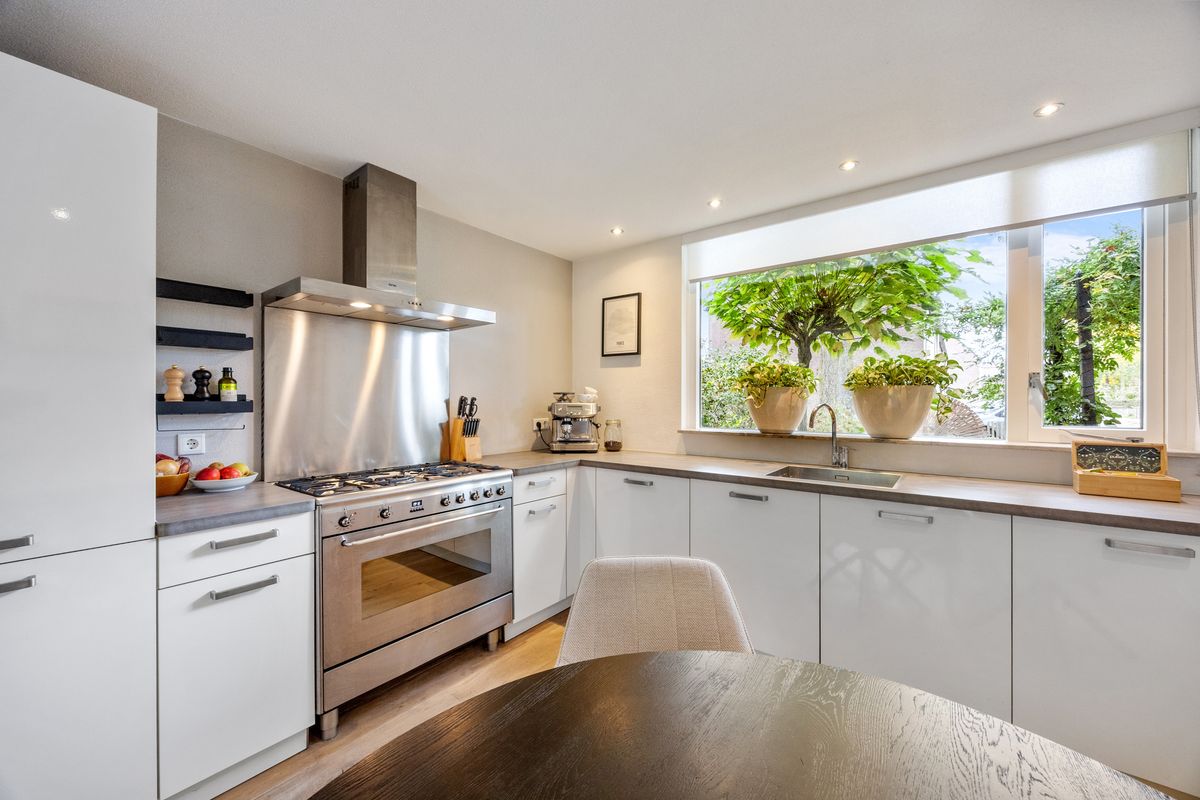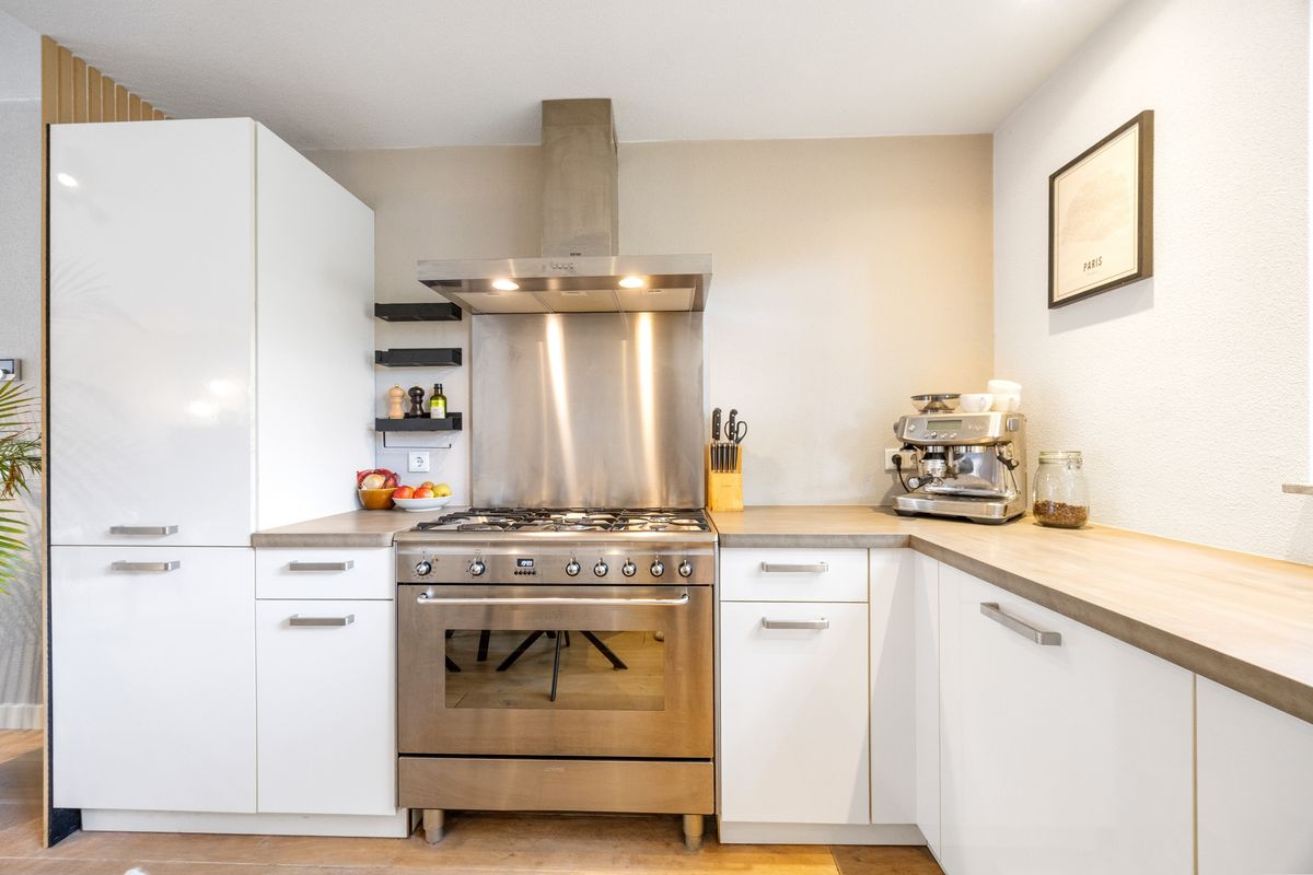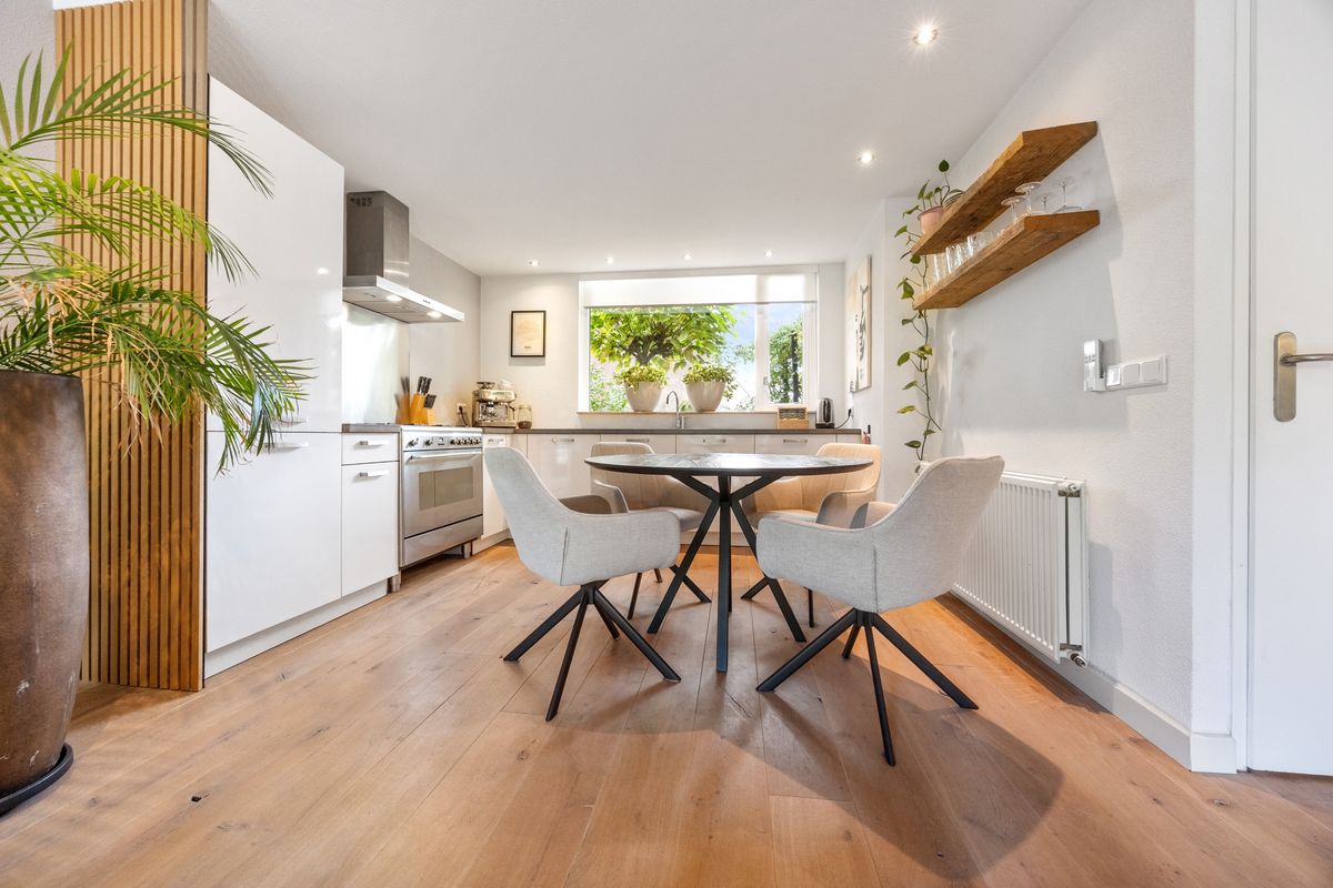 Aan de voorzijde ligt de moderne open keuken, compleet met een 90 cm breed vijfpitsgasfornuis met oven, vaatwasser, afzuigkap en koel-vriescombinatie. Door het raam aan de straatzijde kook je met uitzicht op de groene omgeving. De eettafel vormt het hart van de ruimte: hier eet je samen, werk je overdag of drink je koffie met vrienden. Alles voelt praktisch en prettig in balans.