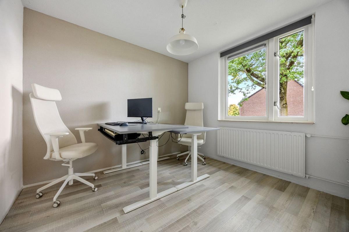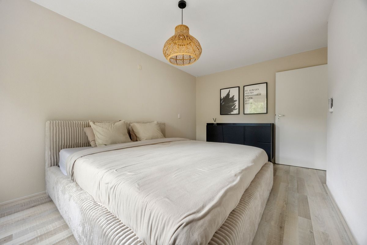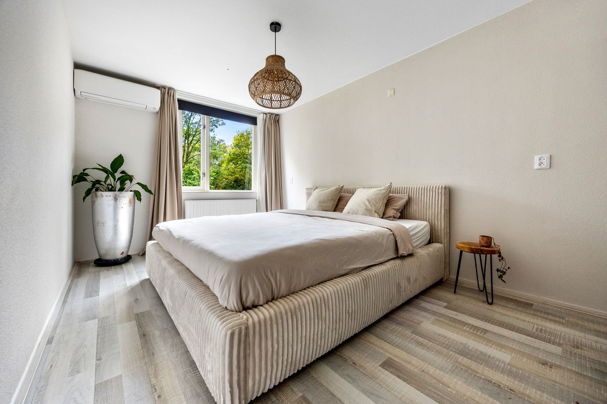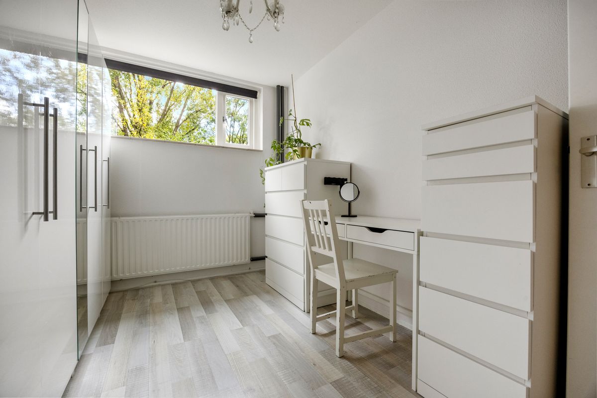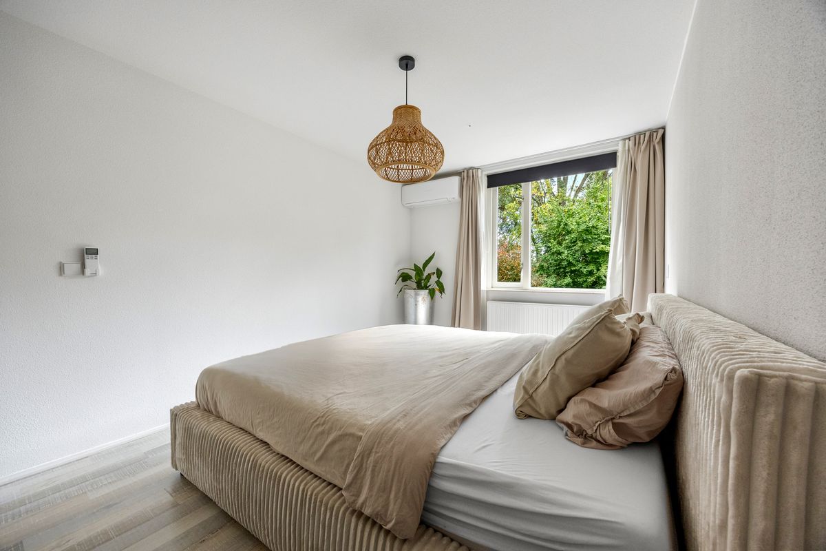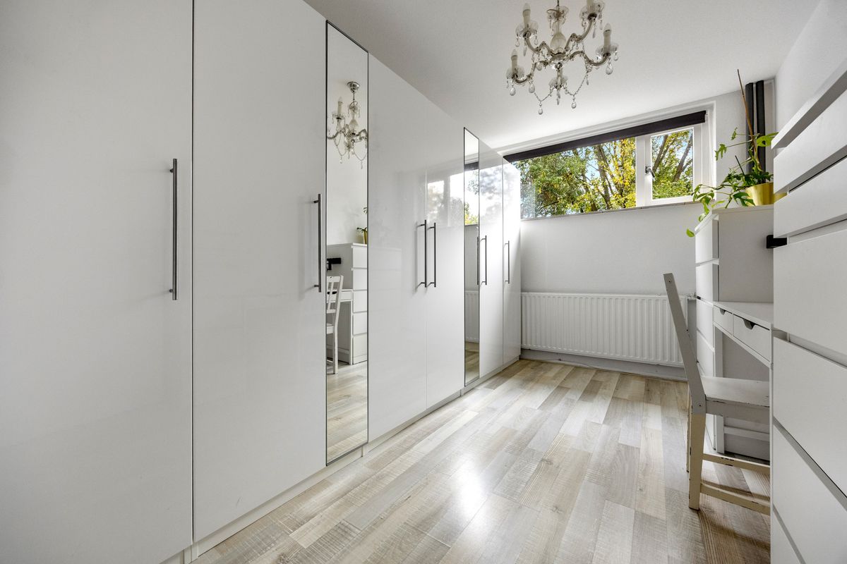 Op de eerste verdieping vind je drie ruime slaapkamers en een moderne badkamer. De kamers aan de achterzijde kijken uit op het park, waardoor het er heerlijk rustig is. De hoofdslaapkamer is ruim, voorzien van airco en genoeg plek voor een groot bed en kast. De kleinste kamer is nu ingericht met een kastenwand, waardoor je er dat fijne walk-in-closetgevoel hebt en kleding niet overal rondslingert. Alle kamers zijn netjes afgewerkt met laminaatvloeren en lichte wanden.