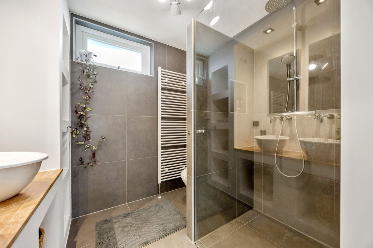 De badkamer voelt luxe aan, met dubbele wastafel, ruime douche met regendouche en losse handdouche, zwevend toilet en designradiator. Alles is strak en goed onderhouden, waardoor je er direct in kunt.