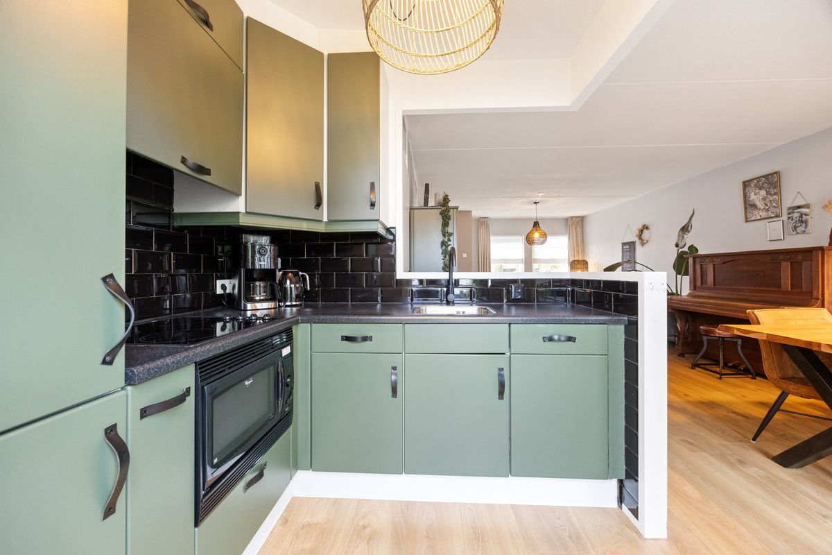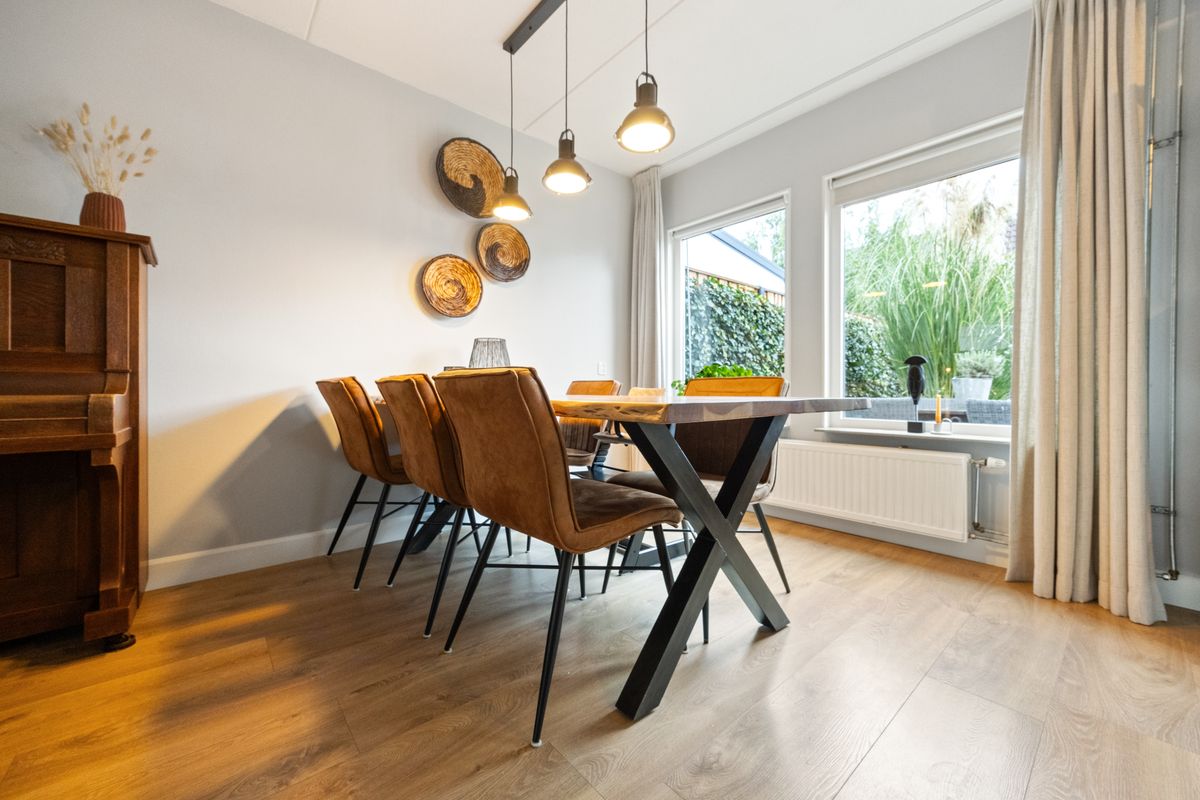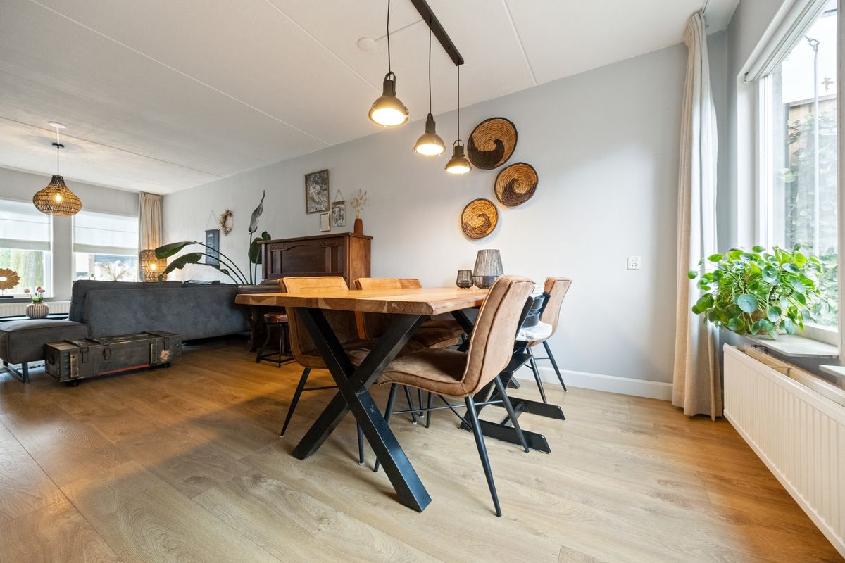 Je stapt binnen in een lichte entree met aan de rechterkant de recent vernieuwde meterkast (driefasen), daarnaast voldoende plek voor je garderobe en je vind hier ook het toilet. Vanuit de entree bereik je de woonkamer: een uitnodigende leefruimte met voldoende ruimte voor een grote hoekbank en een tv-opstelling. De woonkamer staat in open verbinding de keuken. Tussen het zitgedeelte en de keuken is er plek voor een eettafel met zes stoelen. De keuken ligt aan de achterzijde van de woning en is compleet uitgerust met een vaatwasser, koelkast, vriezer, oven en elektrische kookplaat en er is voldoende kastruimte en bergruimte. Dankzij de open verbinding tussen het eet- en zitgedeelte blijf je tijdens het koken altijd in contact met de rest van het huis. Onder de trap naar boven vind je een handige trapkast voor extra opbergruimte. Vanuit de woonkamer heb je toegang tot de opgang naar de eerste verdieping middels een deur.
