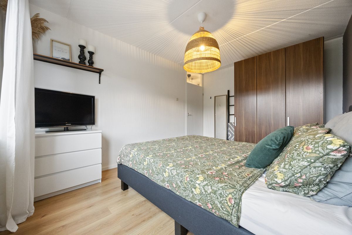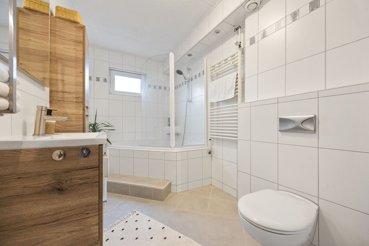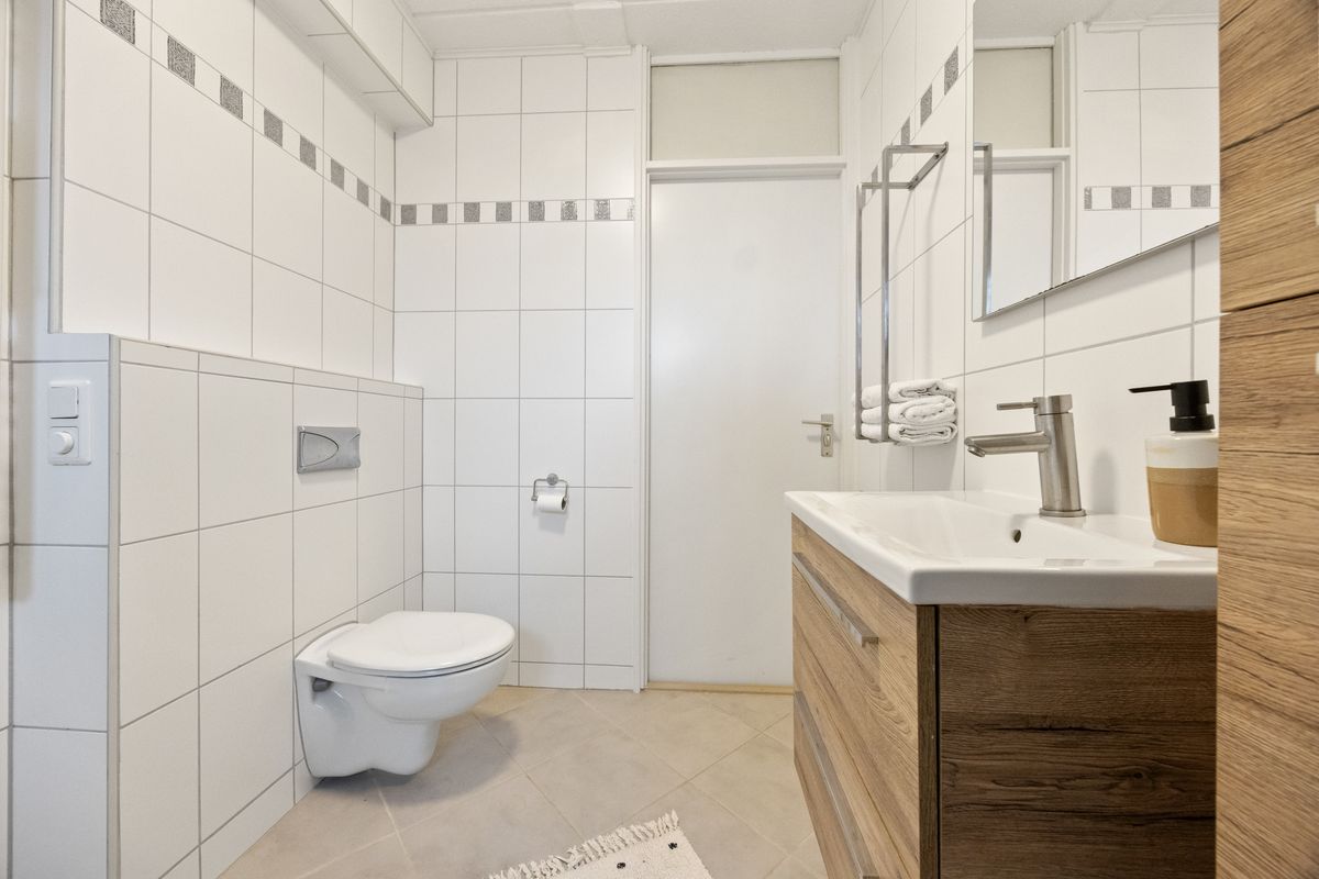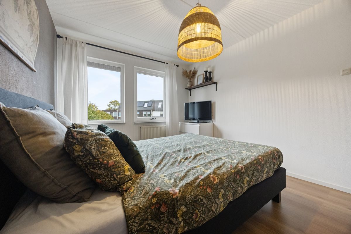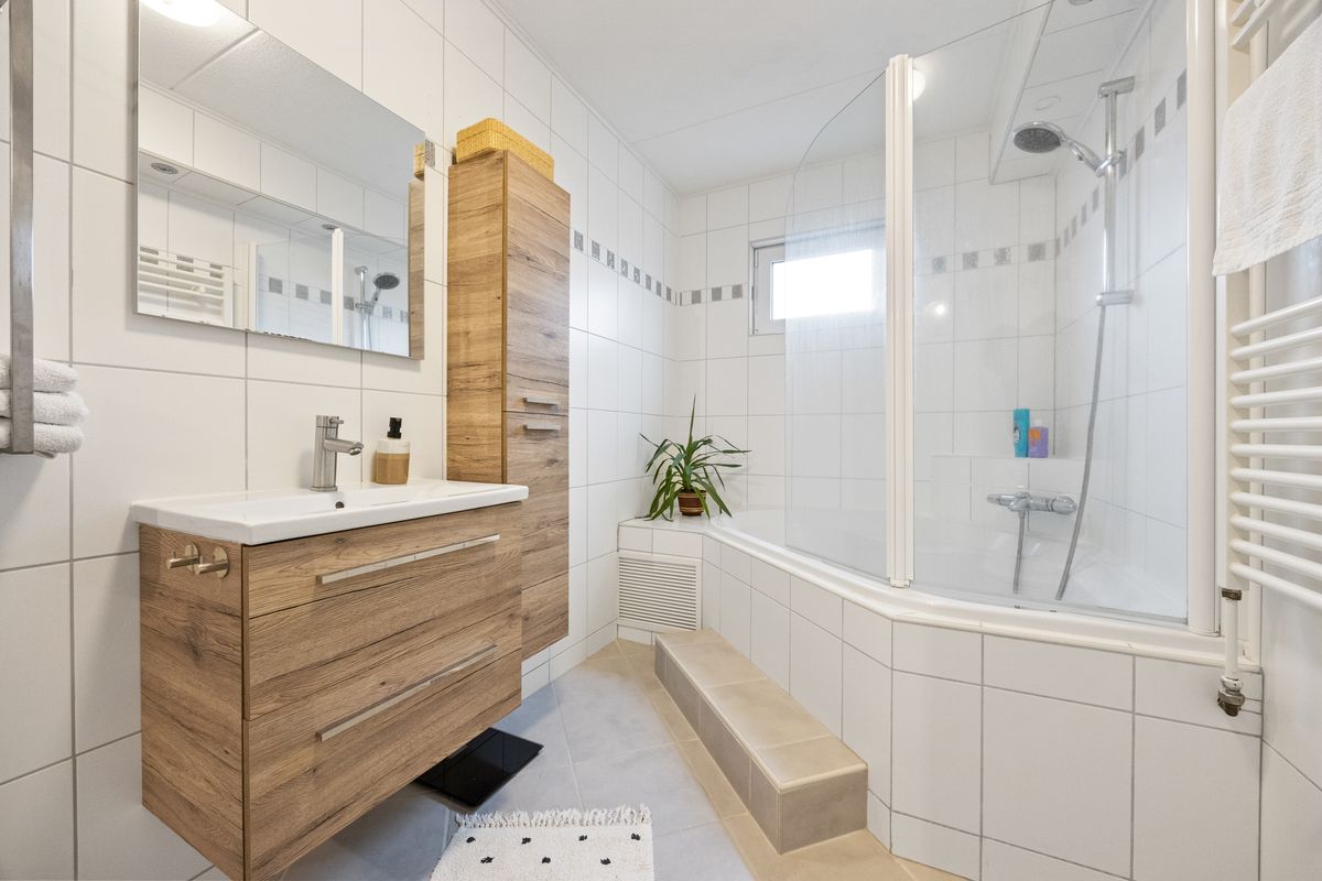 Op de eerste verdieping bevinden zich twee slaapkamers, een waskamer en de badkamer. Aan de voorzijde ligt een compacte kamer met ingebouwde kast, ideaal als wasruimte met wasmachineaansluiting en cv-installatie. Daarnaast een ruime slaapkamer met dakraam en voldoende plek voor een tweepersoonsbed en kledingkast. Aan de achterzijde bevindt zich de grootste slaapkamer van deze verdieping, voorzien van rolluik en veel lichtinval. De badkamer is strak uitgevoerd met een brede wastafel met meubel en kast, zwevend toilet, ligbad met douche, designradiator en zowel mechanische ventilatie als een raam voor natuurlijke ventilatie.