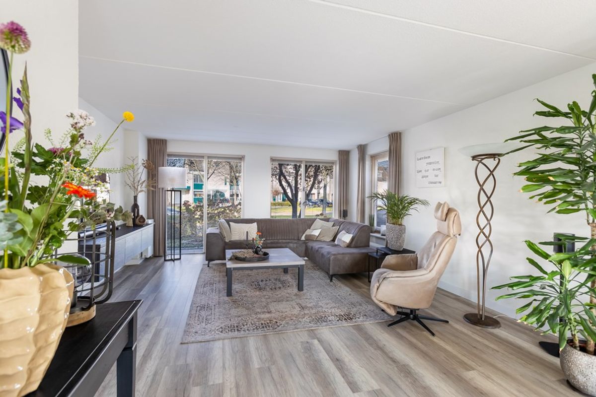 De indeling is als volgt: hal met toilet, meterkast, trapopgang en toegang tot de grote fraaie L-vormige living van 60 m², bestaande uit de oorspronkelijke doorzonwoonkamer, de uitbouw/tuinkamer (met openslaande tuindeuren en aan 3 zijden ramen, waardoor de lichtinval uitzonderlijk groot is) en de ruime eetkeuken met in 2022 geplaatste luxe inbouwkeuken v.v. inbouwapparatuur en natuurstenen aanrechtblad. Vanuit de keuken is er toegang tot de bijkeuken (met aansluitingen en afvoeren t.b.v. de wasapparatuur en een loopdeur naar de tuin en naar de inpandige garage).