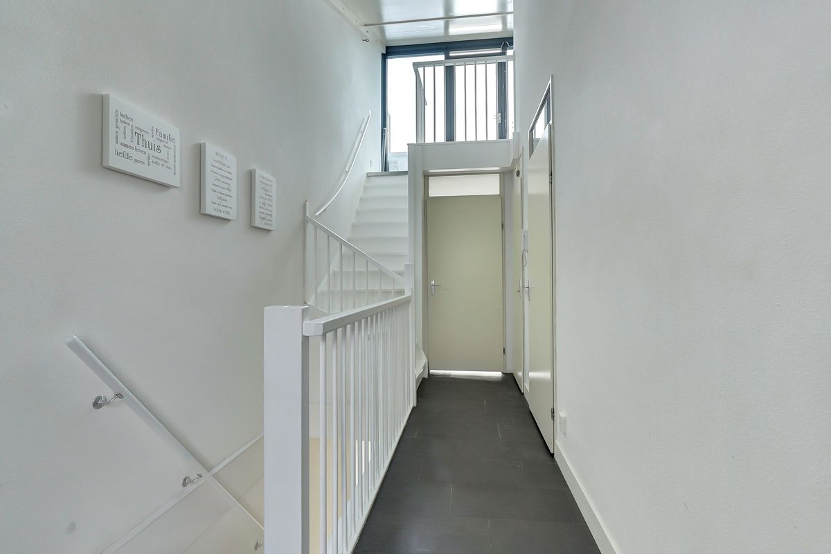 Entree via de galerij, ruime overloop, modern toilet met fontein, meterkast, lichte woonkamer achter, een moderne keuken met inbouwapparatuur en een granieten aanrechtblad. Op de gehele woonverdieping ligt een moderne tegelvloer.