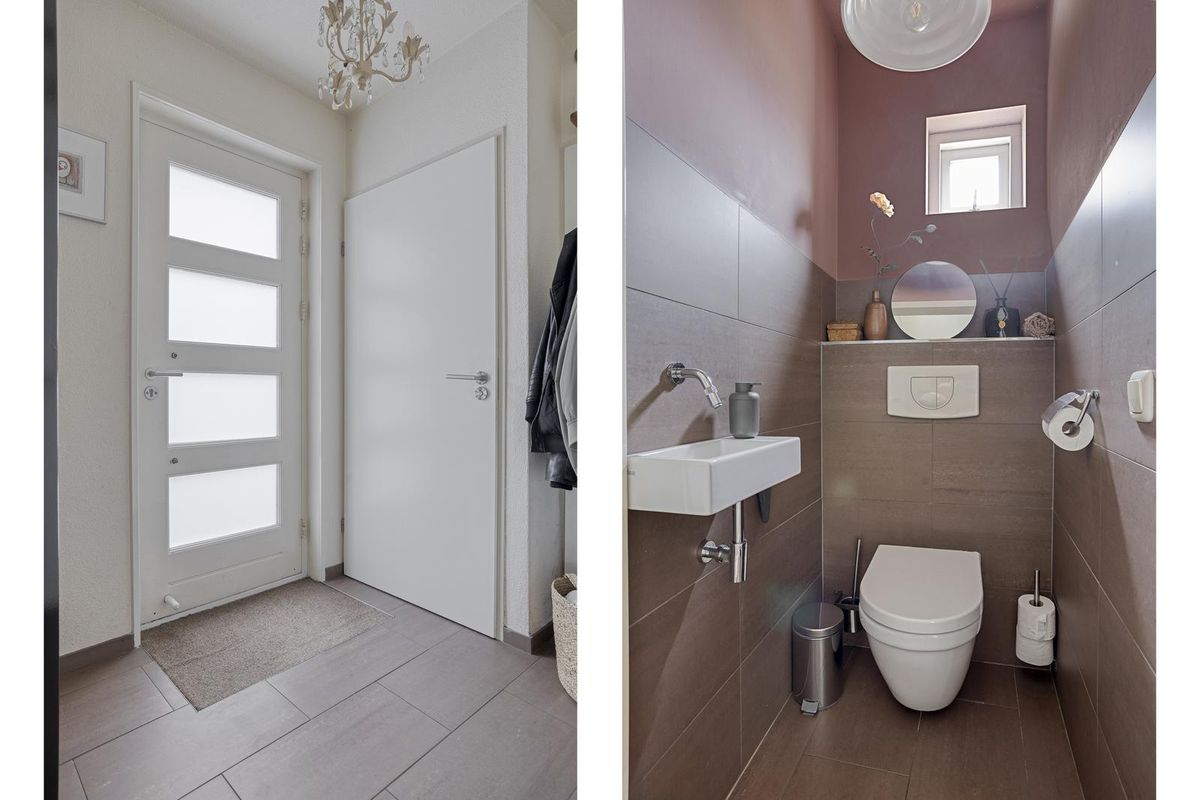 Via de ruime oprit is de entree aan de zijkant van de woning en kom je binnen in de hal met meterkast, trap naar de verdieping en modern hangtoilet met fonteintje.