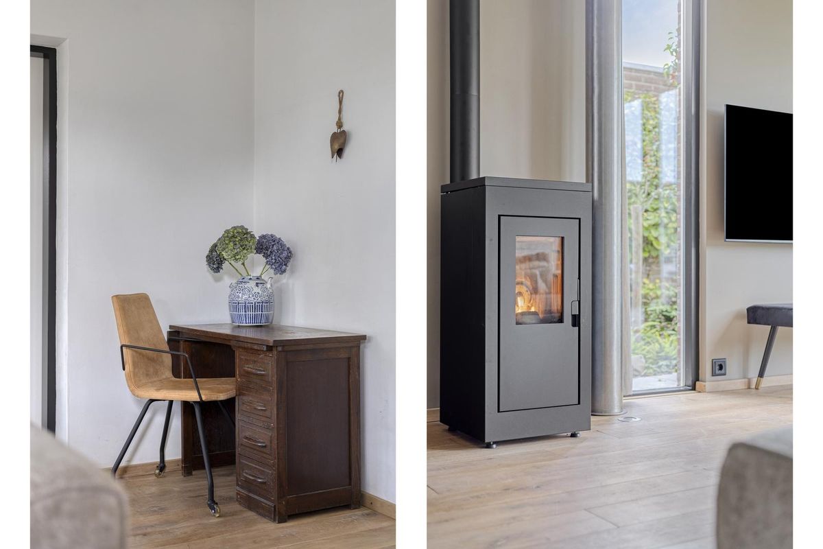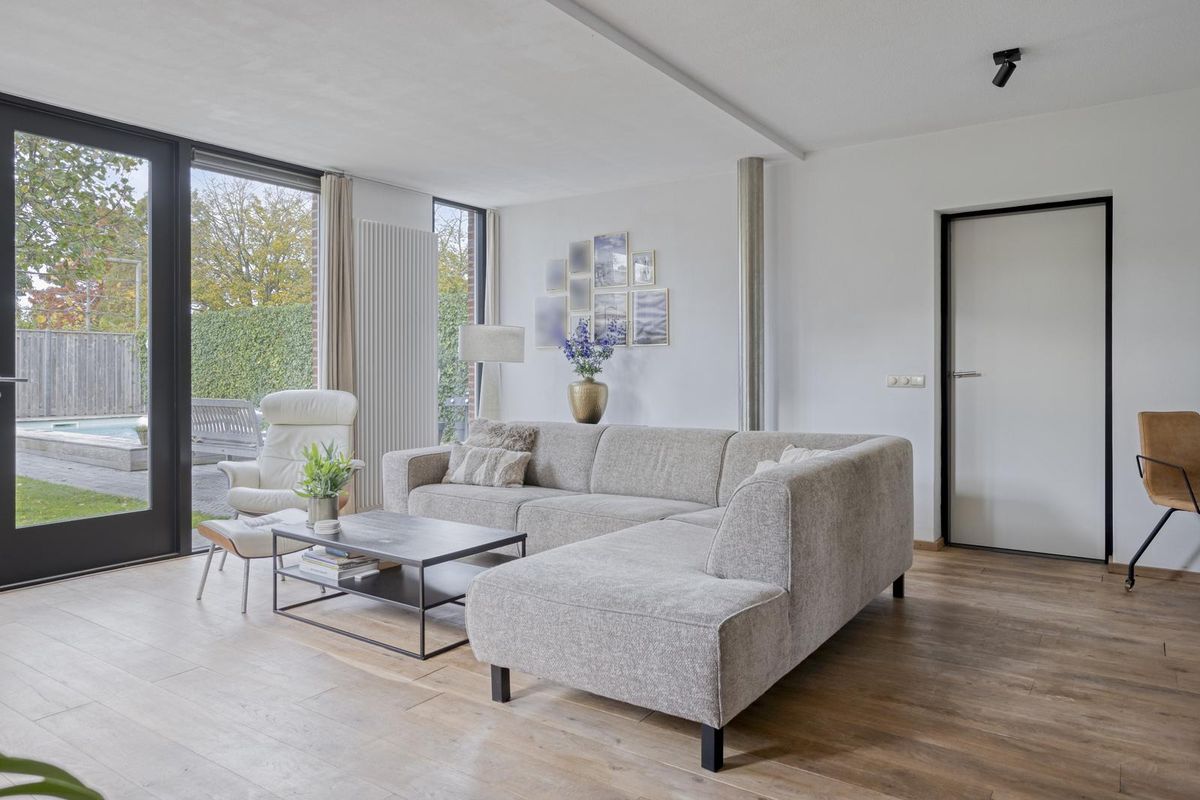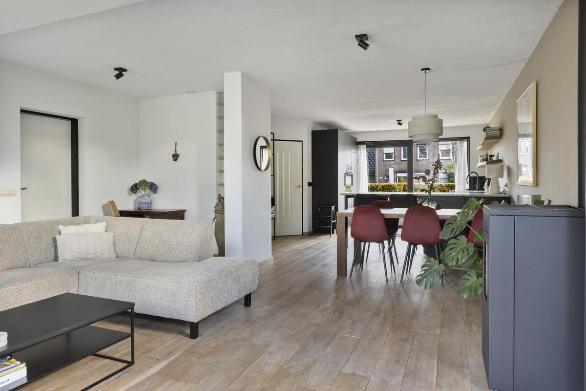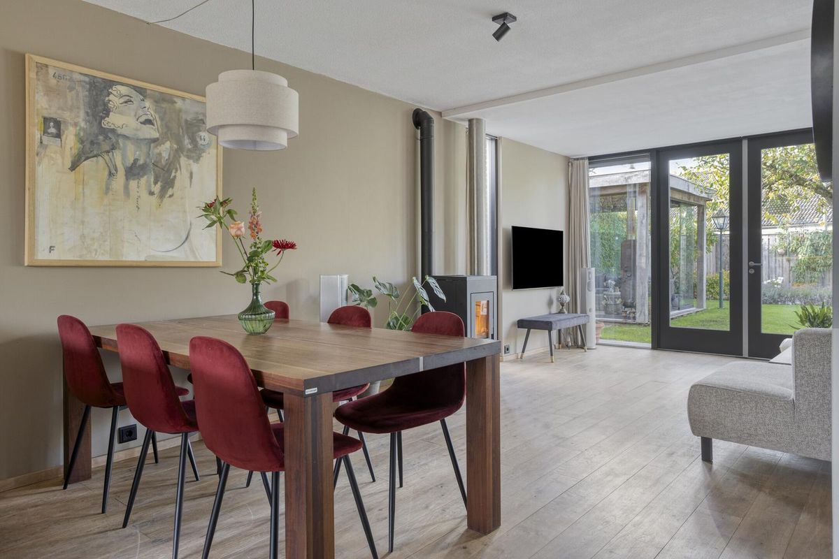 De ruime sfeervolle woonkamer biedt door de grote raampartijen, met dubbele tuindeuren, een fraai zicht op de tuin en zorgt voor een natuurlijke verbinding van de woonkamer met de tuin. De pellet kachel geeft een aangename warmte en zorgt voor een verlaging van de stookkosten. Vanuit de woonkamer is de garage met bijkeuken bereikbaar.