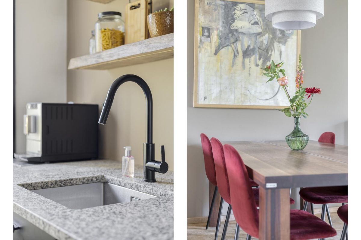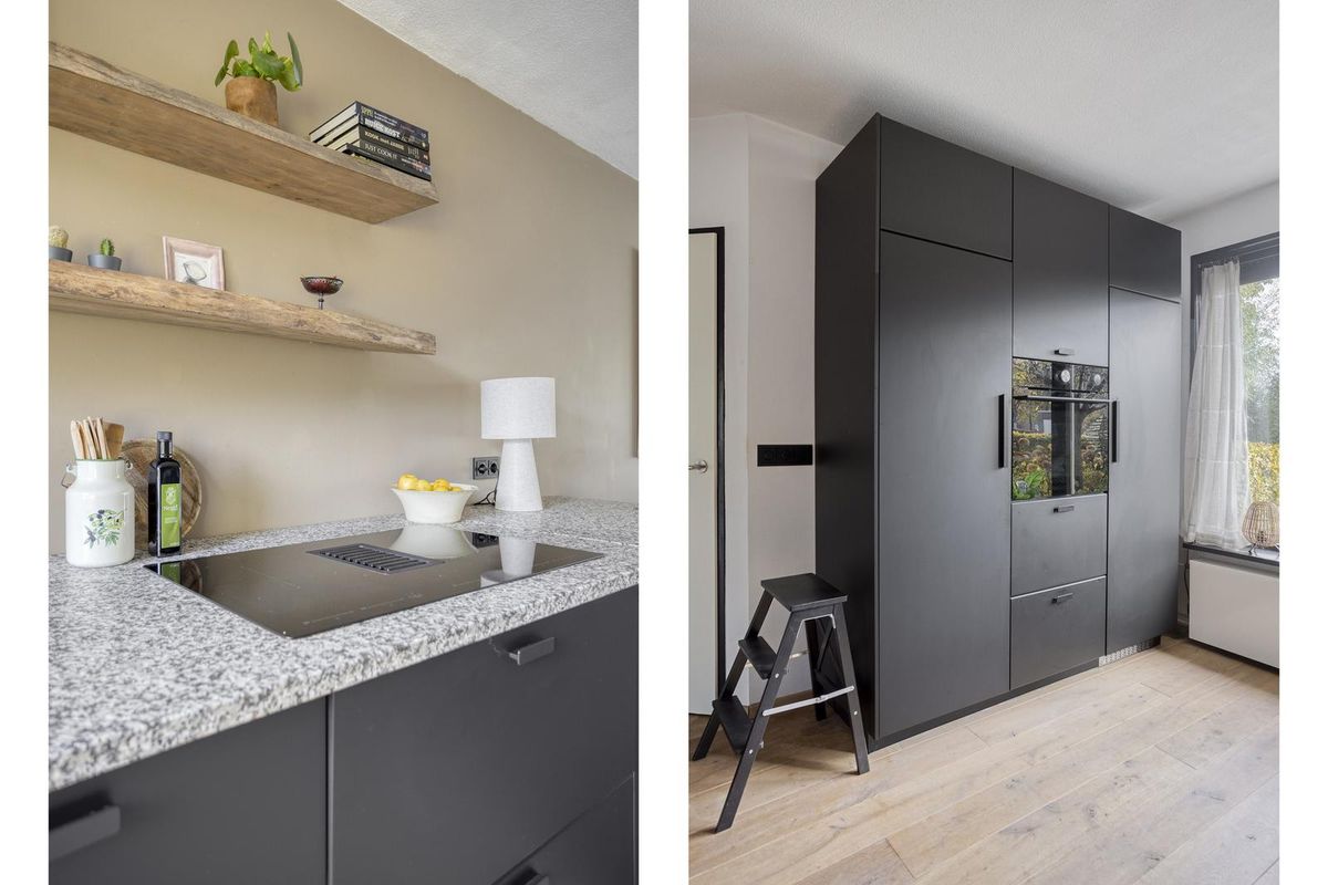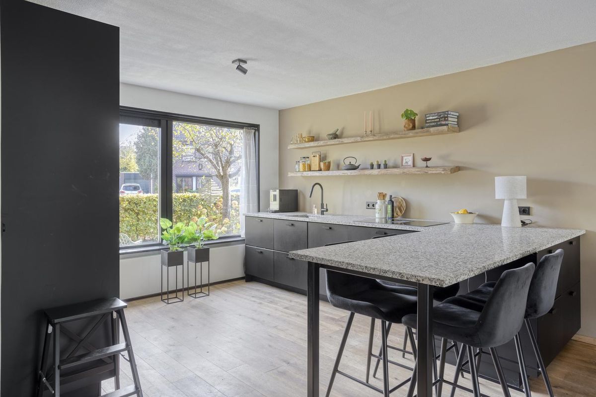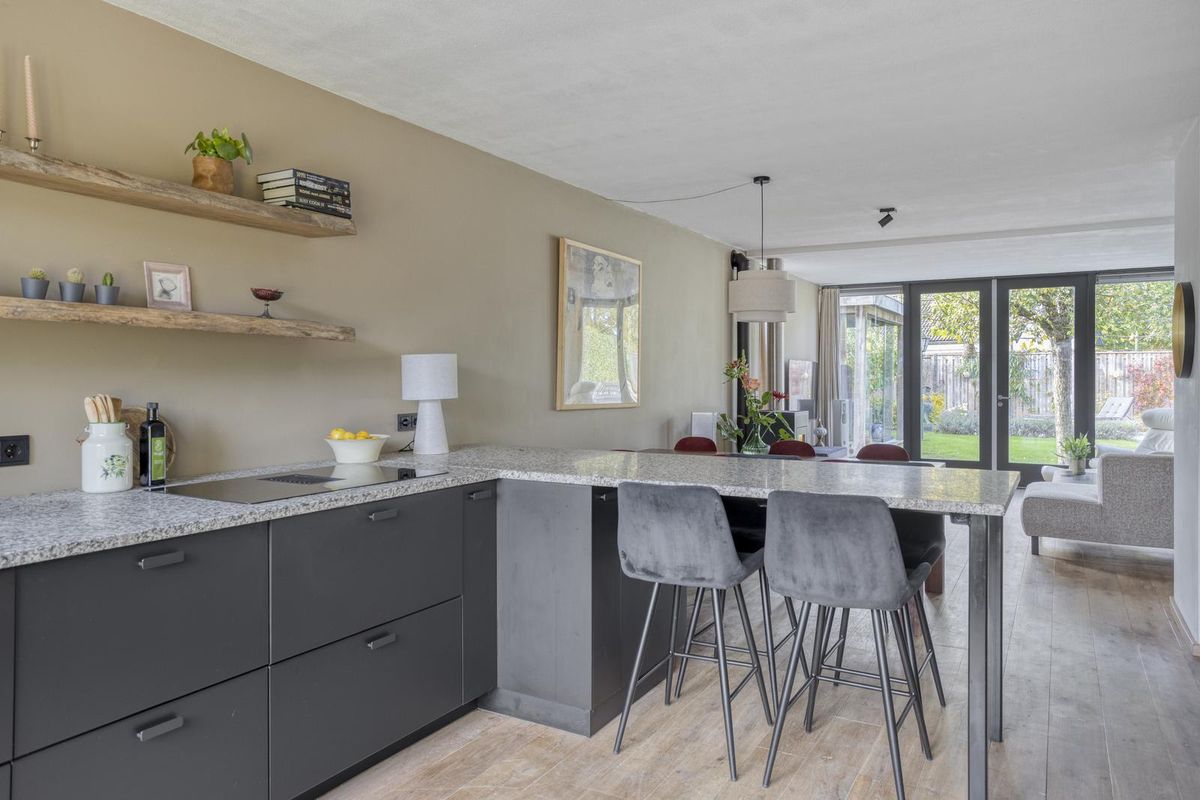 De luxe open keuken (2022) met gezellige eetbar nodigt uit om te ontspannen en te socializen. Een heerlijk plek om te koken en ondertussen gezellig te praten met gezin, familie en/of vrienden terwijl je geniet van een hapje en een drankje. De complete keuken met kastenwand is voorzien van inbouwapparatuur zoals inductiekookplaat met afzuiging, stoomoven, koelkast en vaatwasmachine. Vanuit de keuken is de praktische trappenkast bereikbaar.