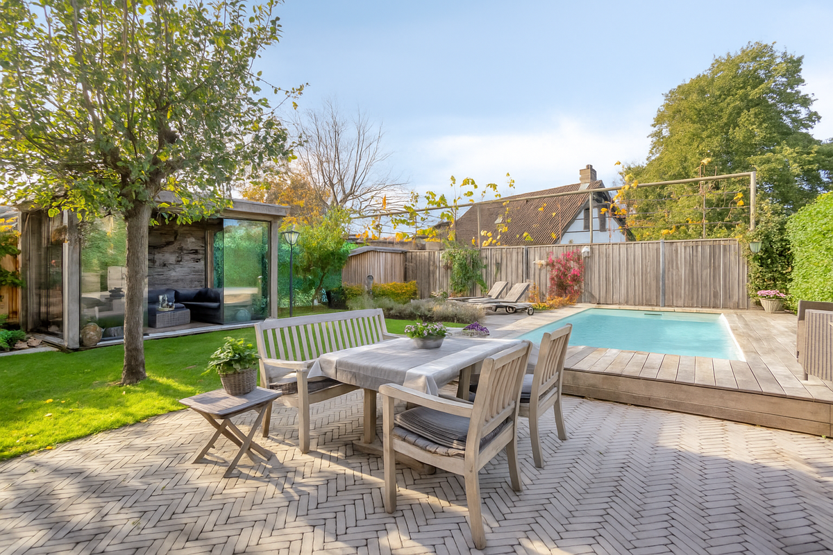 Ontsnap aan de dagelijkse drukte in deze schitterend aangelegde tuin met overkappingen en verwarmd zwembad (zoutwater 2020 met zonnecollectoren en warmtepomp). Zie je jezelf hier al genieten na een duik van de zon en een drankje op één van de buitenterrassen of in het voor- en najaar gezellig met elkaar rond de houtkachel in de afsluitbare overkapping. De overkapping aan de zijgevel van de woning geeft nog toegang tot een berging en poort naar de voortuin.