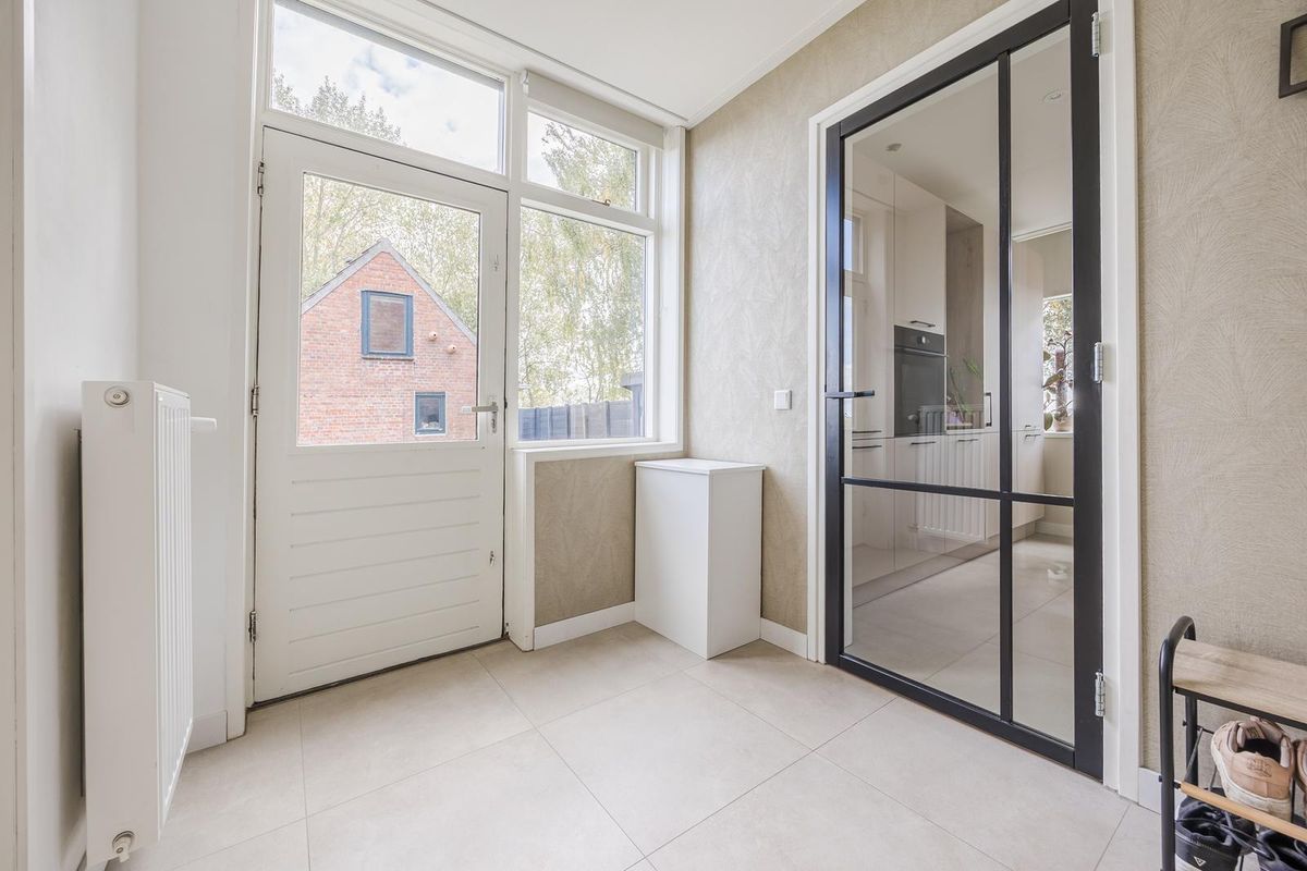 De hal met tegelvloer is voorzien van een schitterende industriële deur en biedt toegang tot de keuken, bijkeuken en de badkamer. Vanuit de hal heeft u verder toegang tot de kelder, de trap naar de 1e verdieping en achtertuin.
