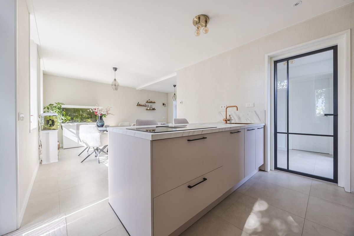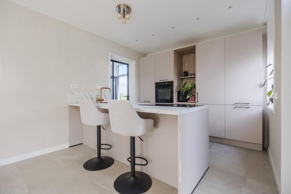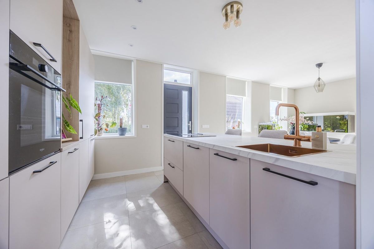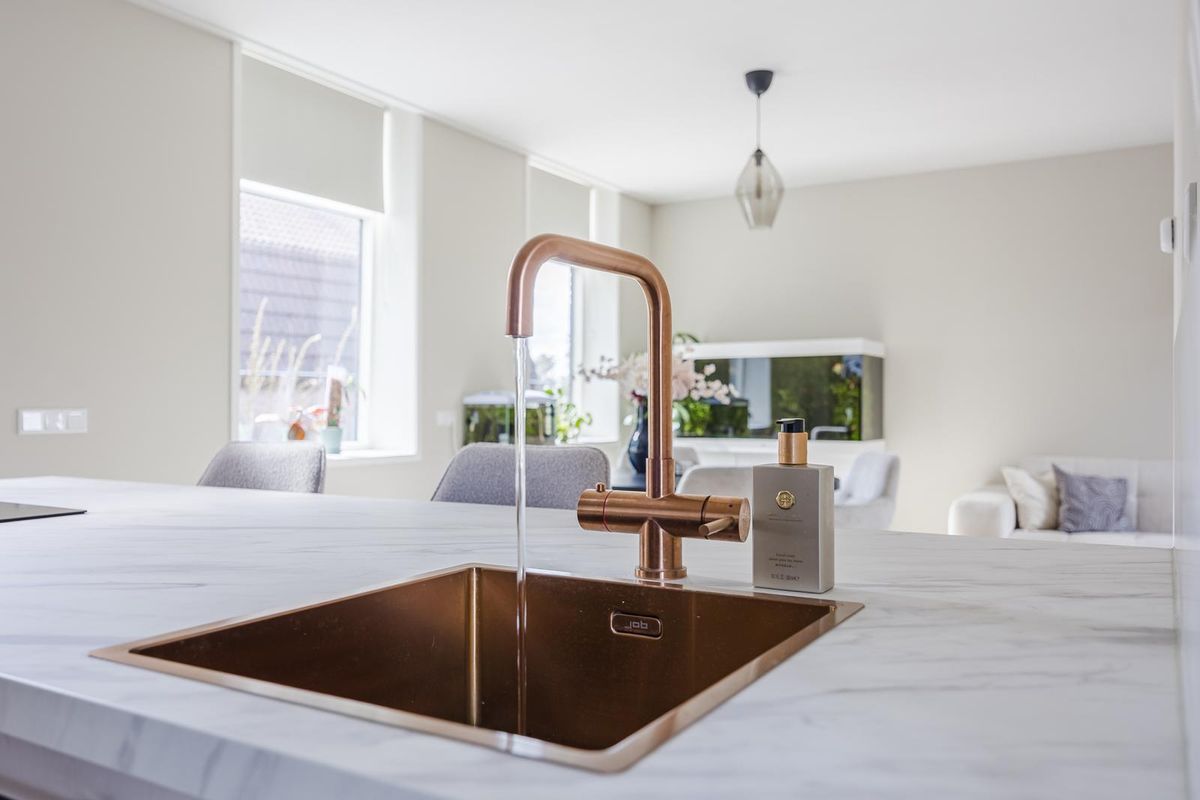 De open leefkeuken is een echt pareltje van het huis. De keuken is uitgevoerd in een Kasmir kleur, voorzien van een kook/spoeleiland, een koffiecorner en inbouwapparatuur: Inductie met geïntegreerd afzuigsysteem (Whirlpool), oven, vaatwasser en een koelkast met versgedeelte.