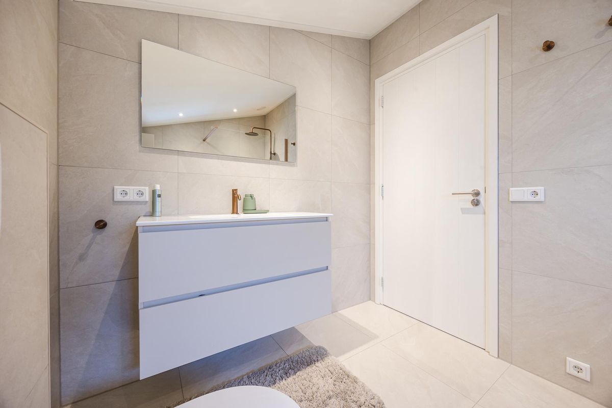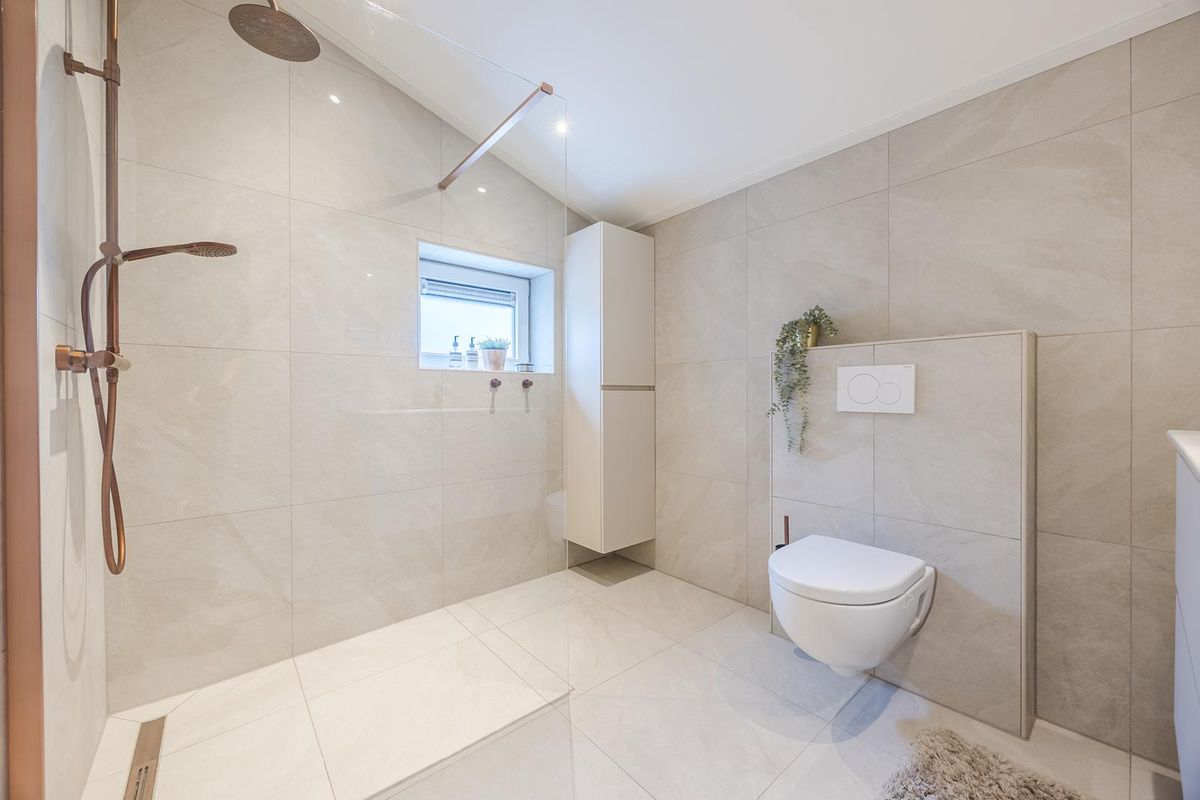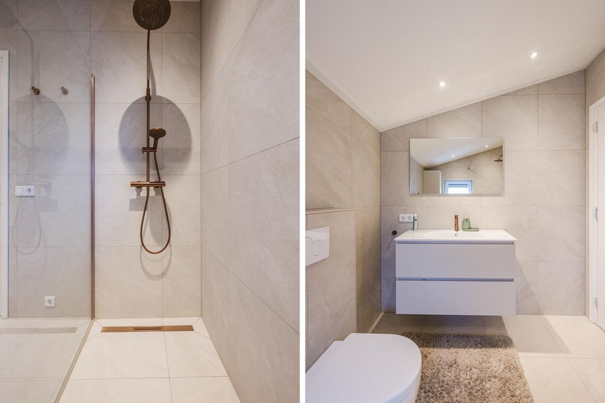 De schitterende badkamer is modern en voorzien van luxe koperen kranen en koperen douche. De badkamer is voorzien van een tegelvloer, wastafelmeubel, inloop regendouche, een toilet en inbouwspots.