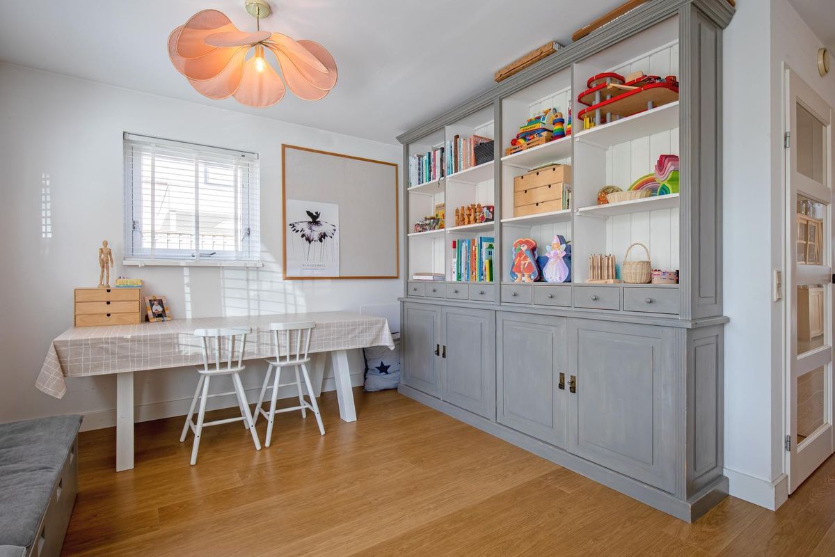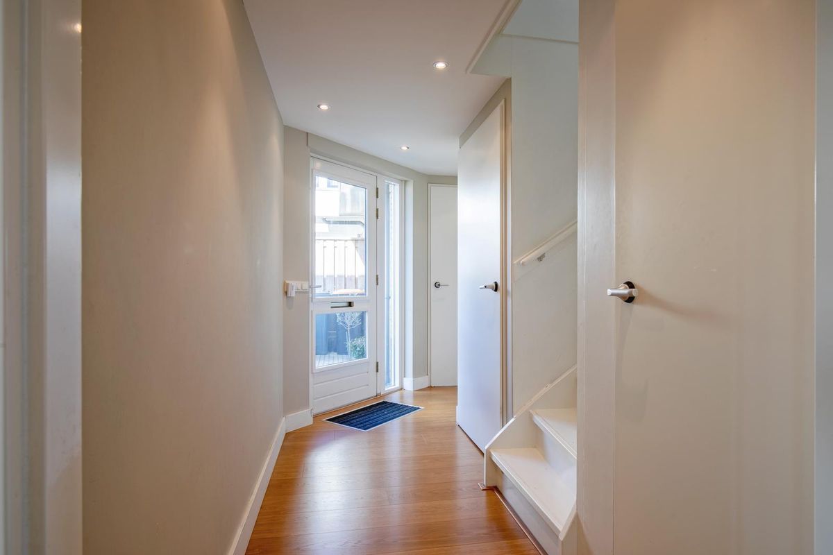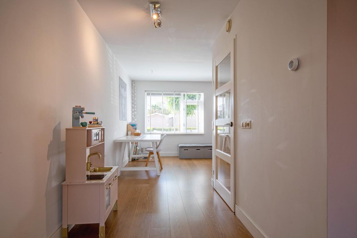 Grenzend aan de keuken bevindt zich de bijkeuken, waar de cv-ketel is geplaatst en aansluitingen aanwezig zijn voor zowel de wasmachine als de droger. Deze praktische ruimte biedt extra bergruimte.